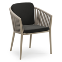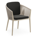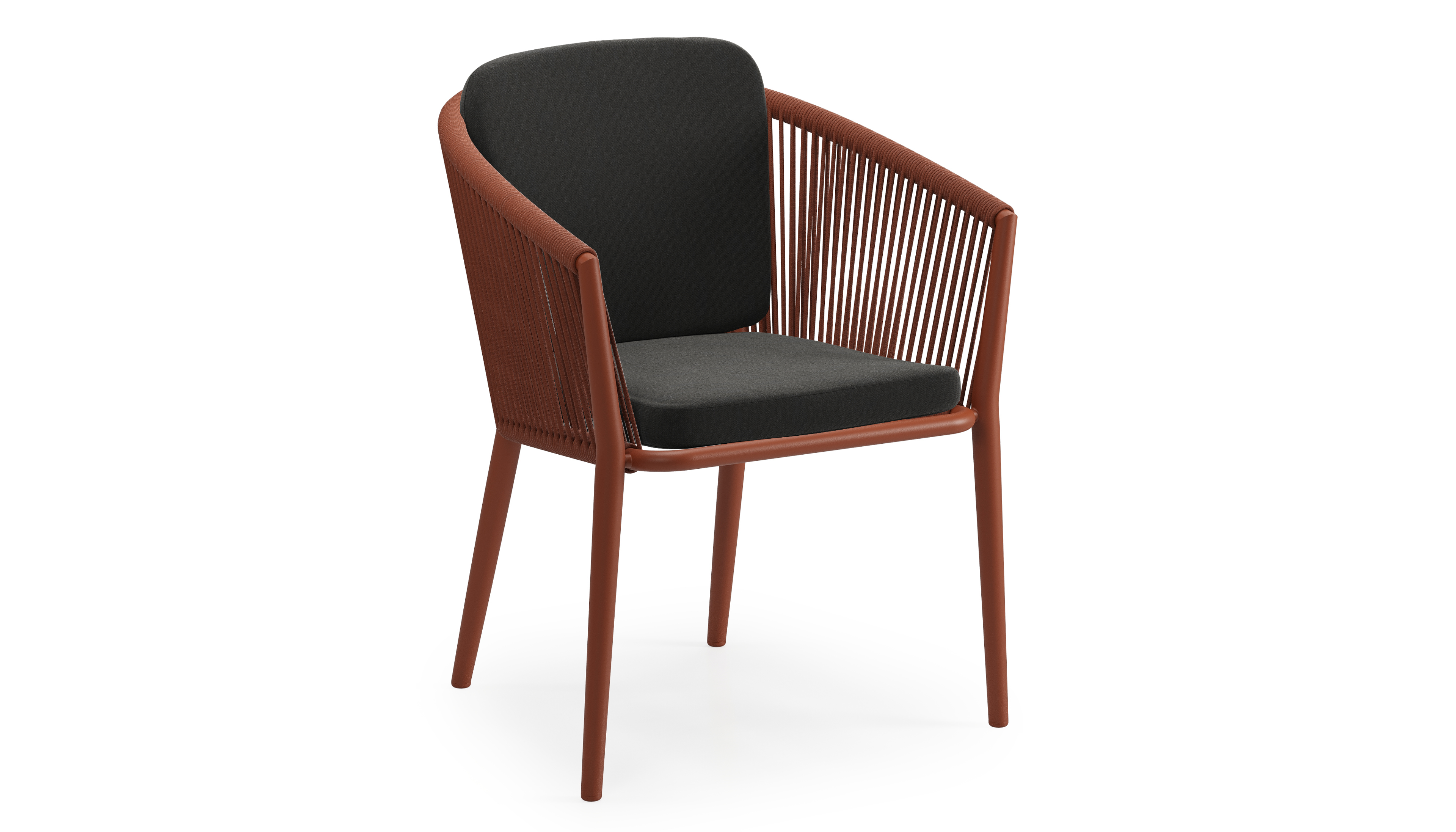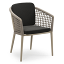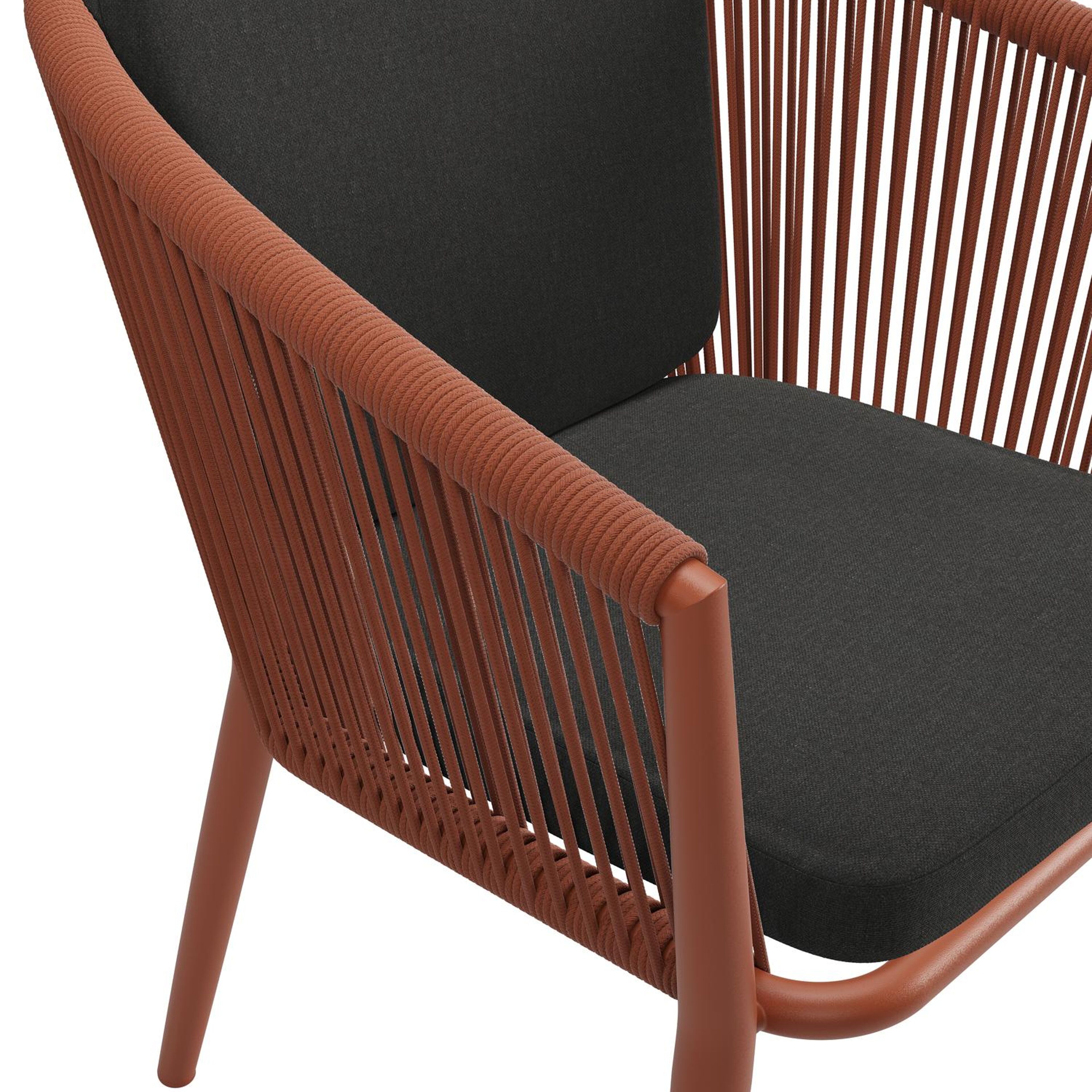 Chaise de jardin Orso en aluminium brun rouille et corde ronde tissée verticalement brun rouille avec coussin en All Weather Sunbrella® Luxe Natte Sooty | Exterioo mobilier de jardin