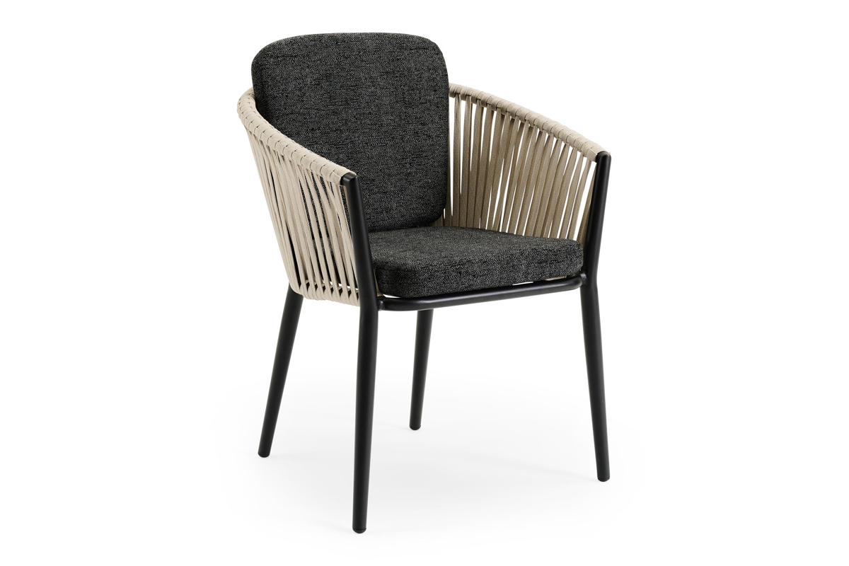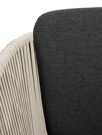 Chaise de jardin Orso en aluminium noir et corde plate tissée verticalement beige avec coussin en chartres sooty all weather sunbrella® luxe | Exterioo mobilier de jardin