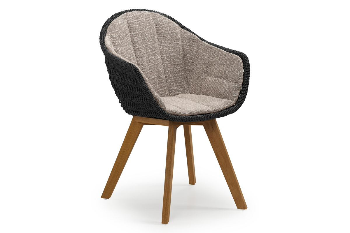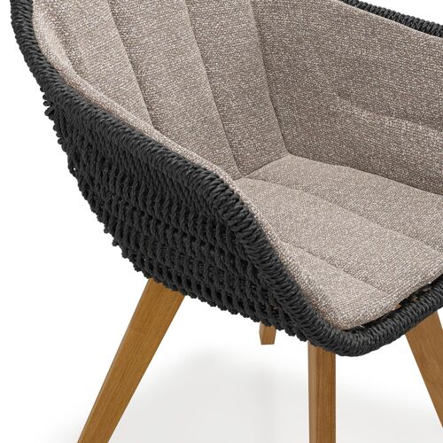 Chaise de jardin Pagino en teck naturel et résine tressée ronde noir avec coussin en All Weather Sunbrella® Luxe Wander Manioc | Exterioo