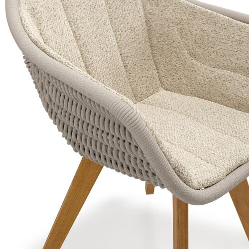 Chaise de jardin Pagino en teck naturel et corde ronde tissée verticalement beige avec coussin en All Weather Cosytica Bora Forest | Exterioo