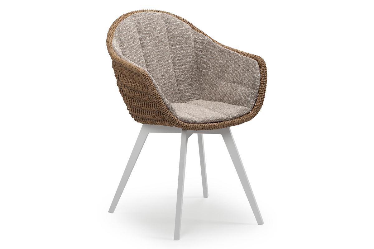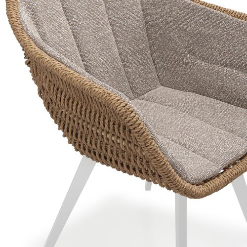 Chaise de jardin Pagino en aluminium blanc et résine tressée ronde brun avec coussin en All Weather Sunbrella® Luxe Wander Manioc | Exterioo