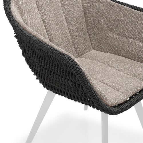 Chaise de jardin Pagino en aluminium blanc et résine tressée ronde noir avec coussin en All Weather Sunbrella® Luxe Wander Manioc | Exterioo