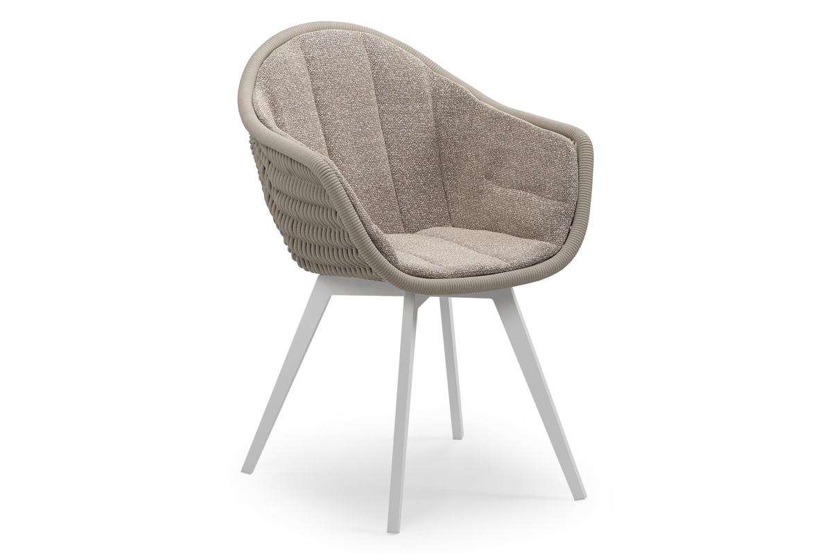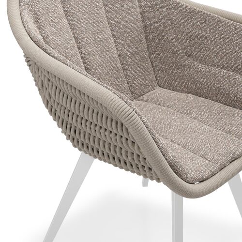 Chaise de jardin Pagino en aluminium blanc et corde ronde tissée verticalement beige avec coussin en All Weather Sunbrella® Luxe Wander Manioc | Exterioo
