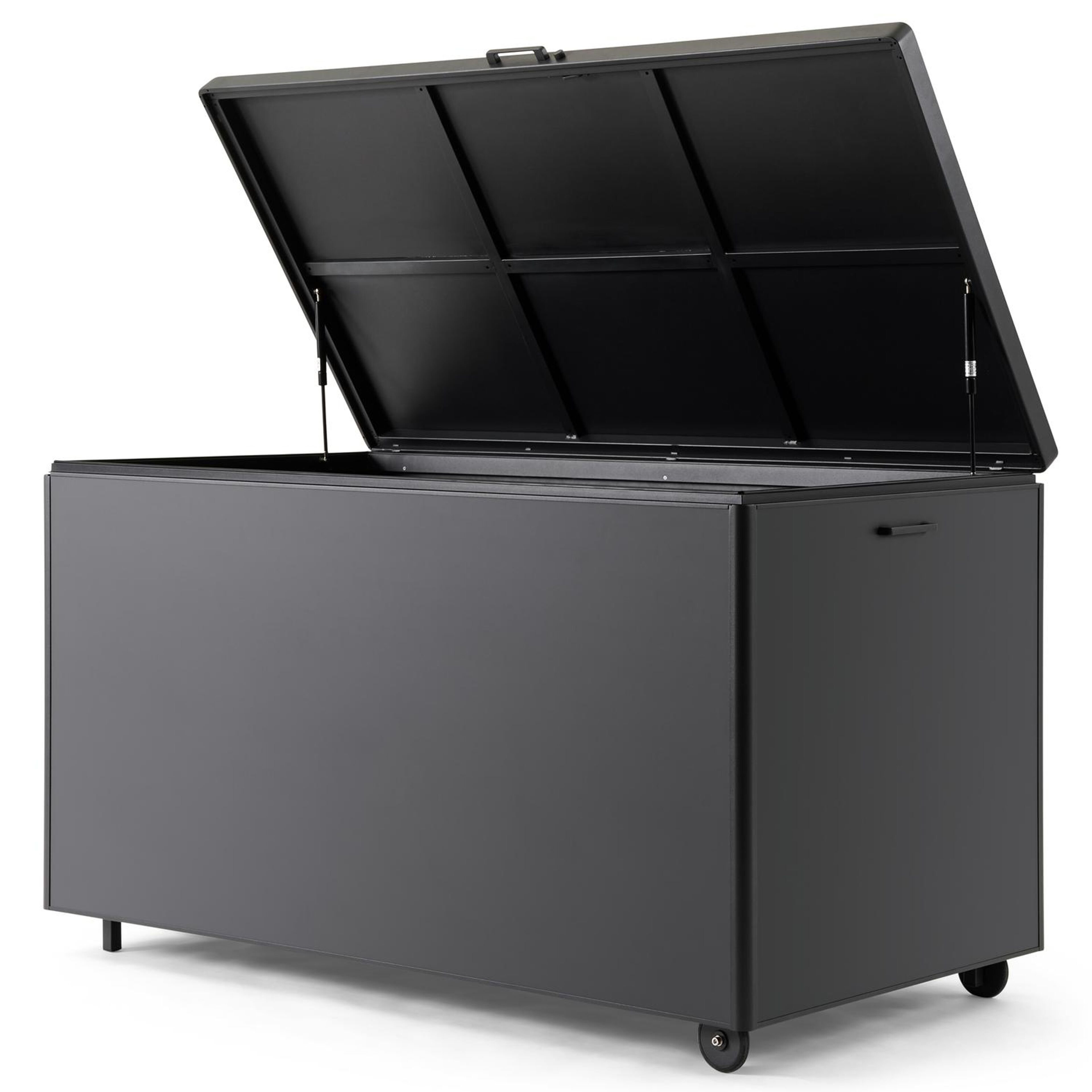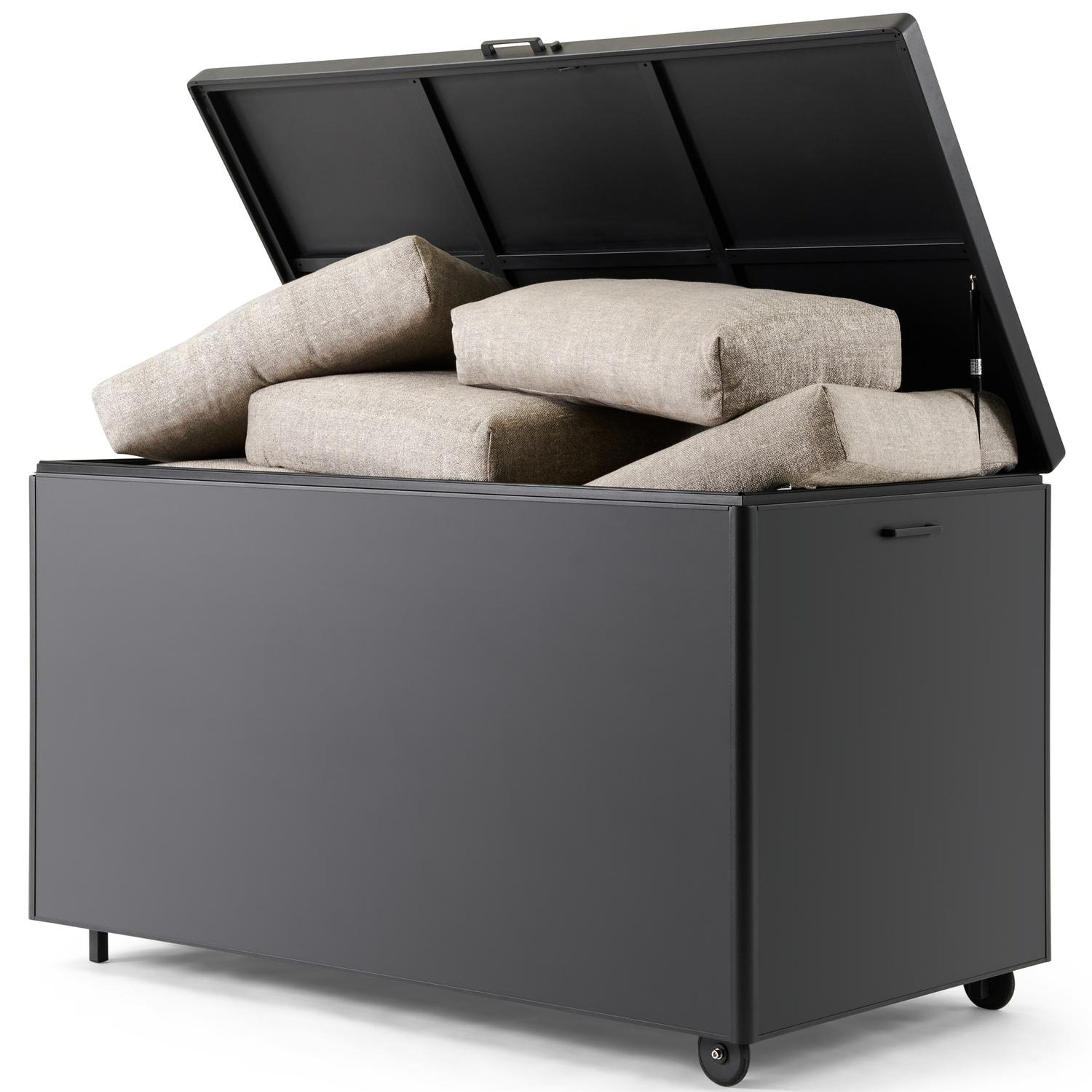 Le coffre à coussins est une boà®te à coussins de haute qualité idéale pour ranger vos coussins de salon Essentials. Le coffre à coussins est en PVC et finie avec un extérieur en aluminium. Le couvercle se ferme facilement et dispose d'un système de pompe. De plus, la boà®te à coussins est facile à déplacer grâce aux roues et aux poignées. Le fond de la boà®te à coussins est équipé d'une ventilation.