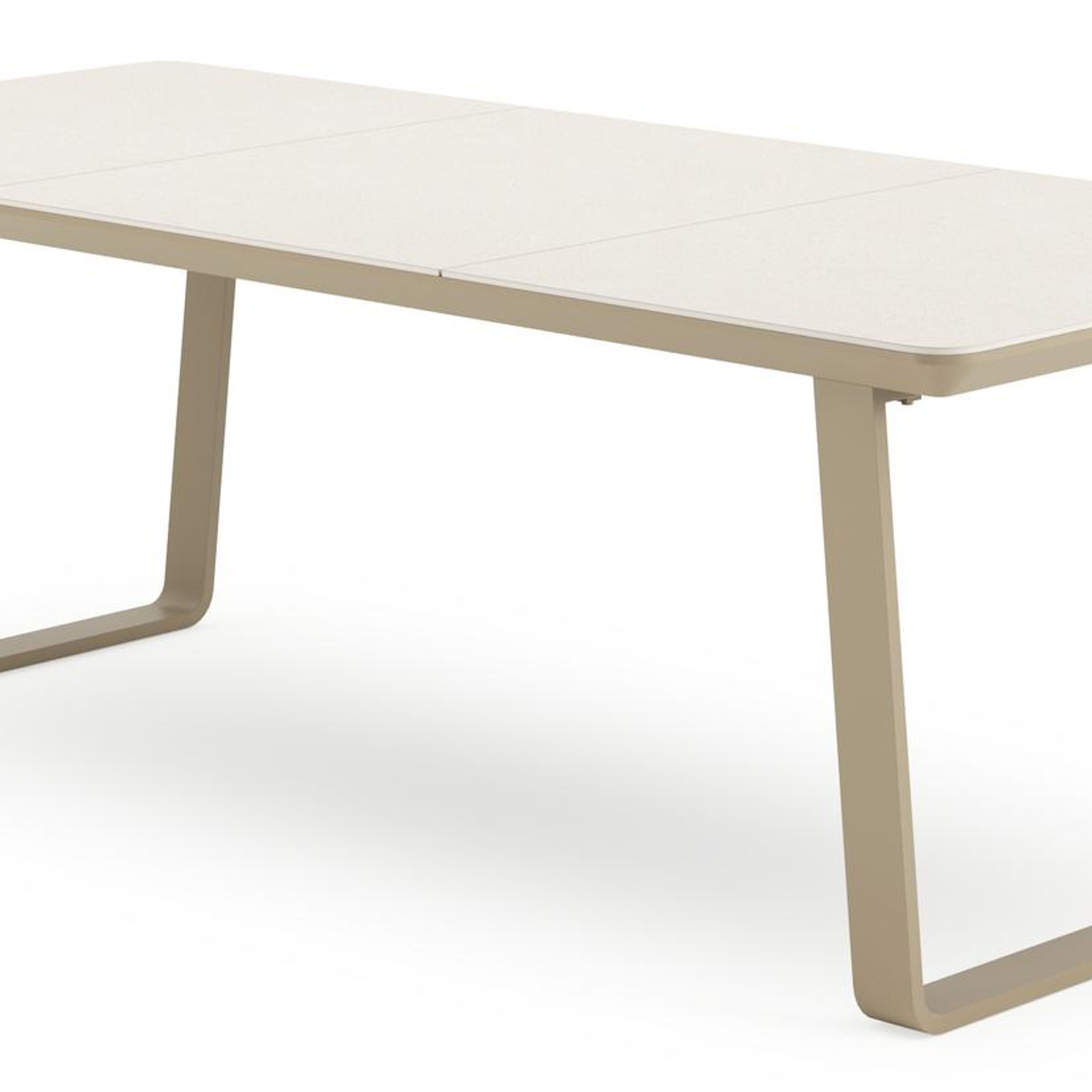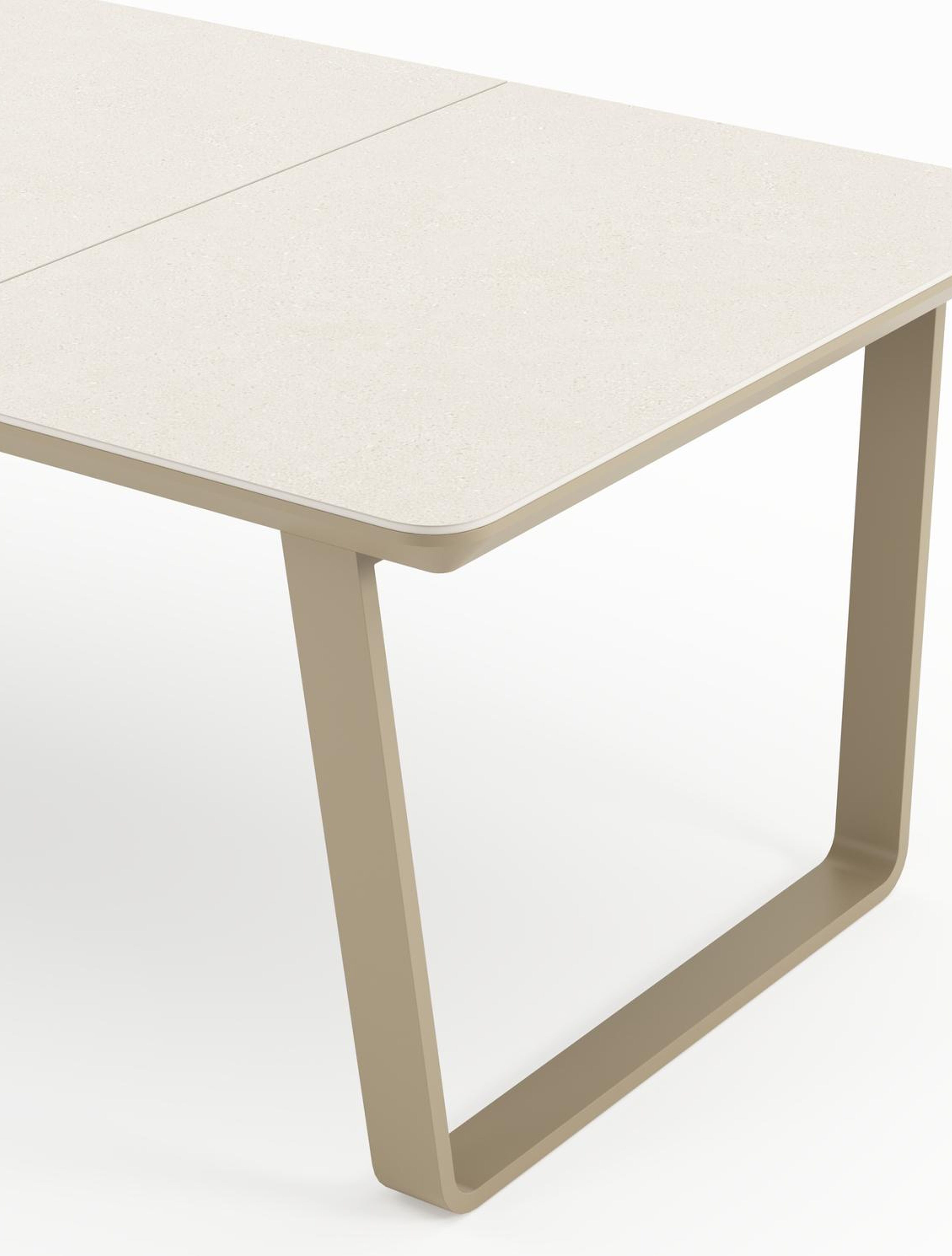Un plateau de Sintered stone contient différents types de minéraux qui sont cuits à une pression encore plus élevée que la céramique, tout en conservant les mêmes propriétés. Ce matériau est extrêmement robuste. Il résiste au gel, à la chaleur, aux rayures et est facile à nettoyer. Le plateau de la table est composé de plusieurs pièces.