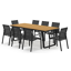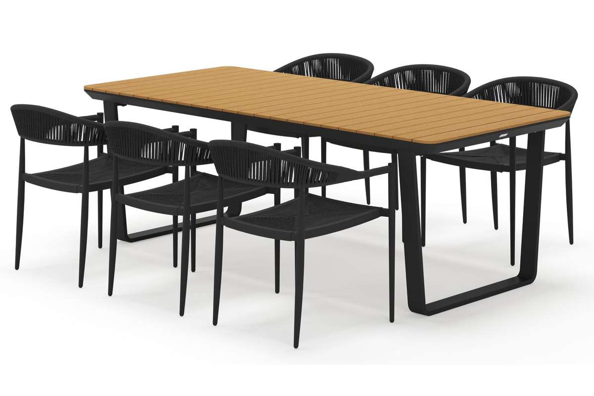 La table de jardin Alora présente un style spécifique avec ses lignes arrondies. L’armature se termine de manière inclinée et le plateau suit le bord. Les pieds de table trapézoïdaux sont intégrés sous l’armature et la parcourent entièrement.