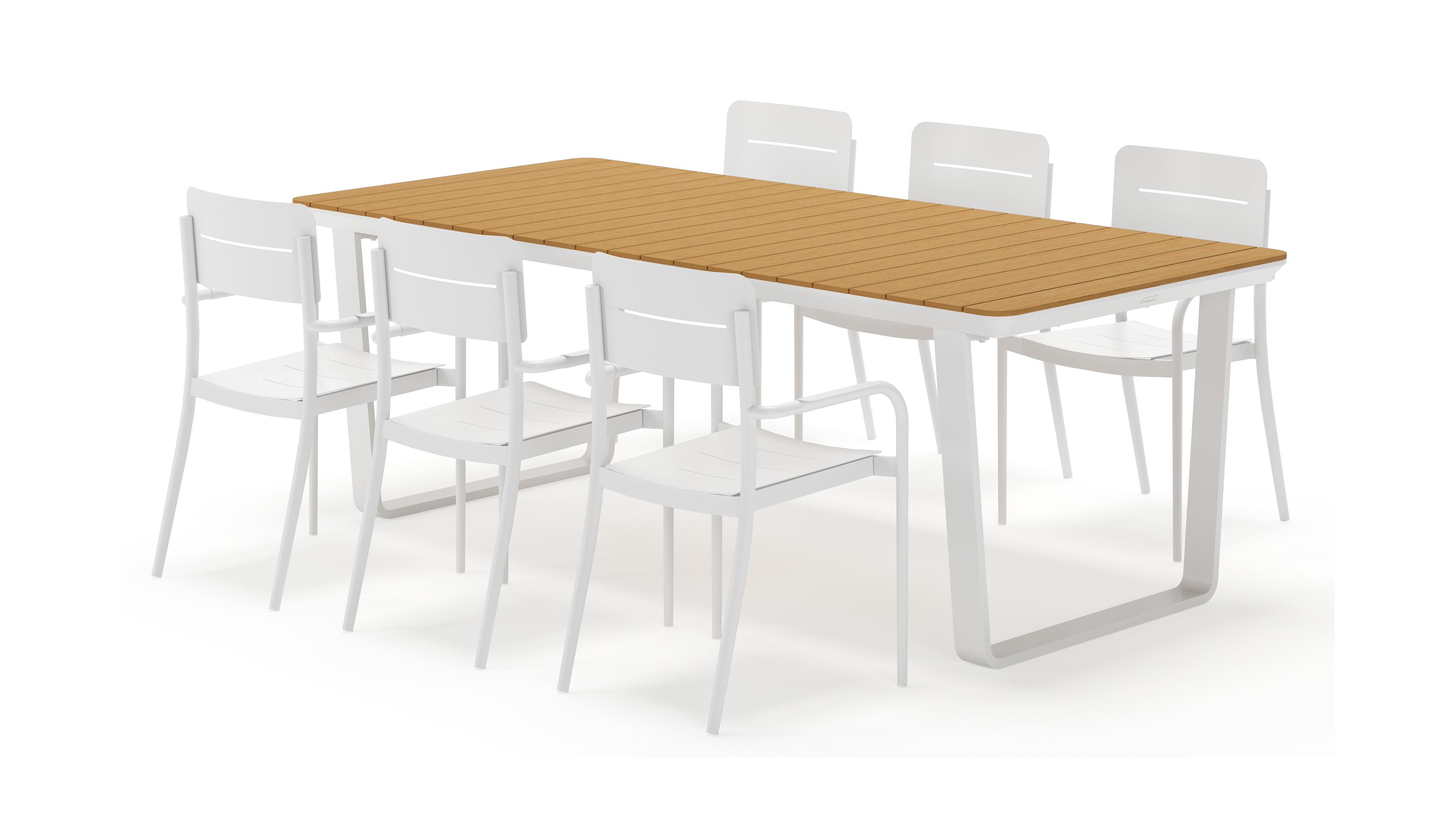 La table de jardin Alora présente un style spécifique avec ses lignes arrondies. L’armature se termine de manière inclinée et le plateau suit le bord. Les pieds de table trapézoïdaux sont intégrés sous l’armature et la parcourent entièrement.