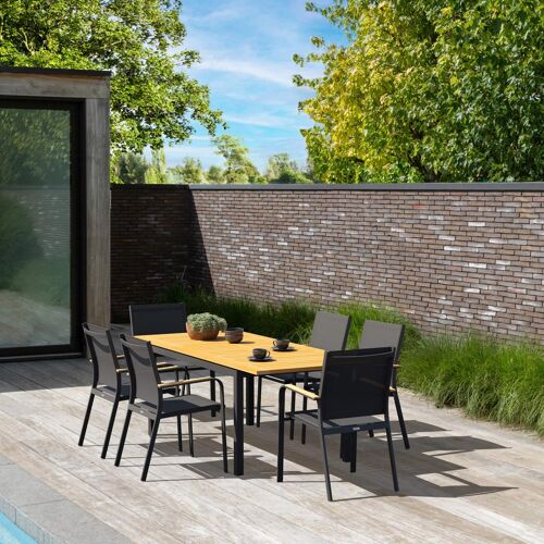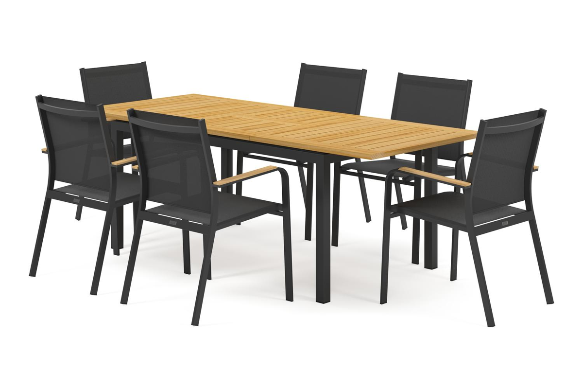 La chaise Amalfi est une chaise élégante aux accoudoirs arrondis et a un style naturel donné par ses accoudoirs en teck. La chaise Amalfi a un piètement en aluminium inoxydable. L’assise et le dossier sont en textilène solide, une matière élégante et facile d’entretien. Disponible dans différentes couleurs. La chaise est empilable et est donc facile à ranger.Passez des moments inoubliables à l’extérieur avec Ensemble de jardin Amalfi avec table extensible de qualité.