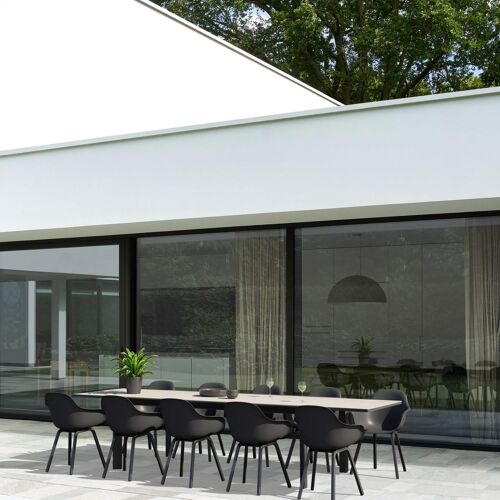 L’armature de la table est en aluminium inoxydable, un matériau robuste mais léger, qui est facile à déplacer. La surface présente une finition lisse, de sorte qu’elle n’attire pas la saleté et est facile à entretenir. Le revêtement poudré garantit la résistance aux UV et aux intempéries de votre meuble.