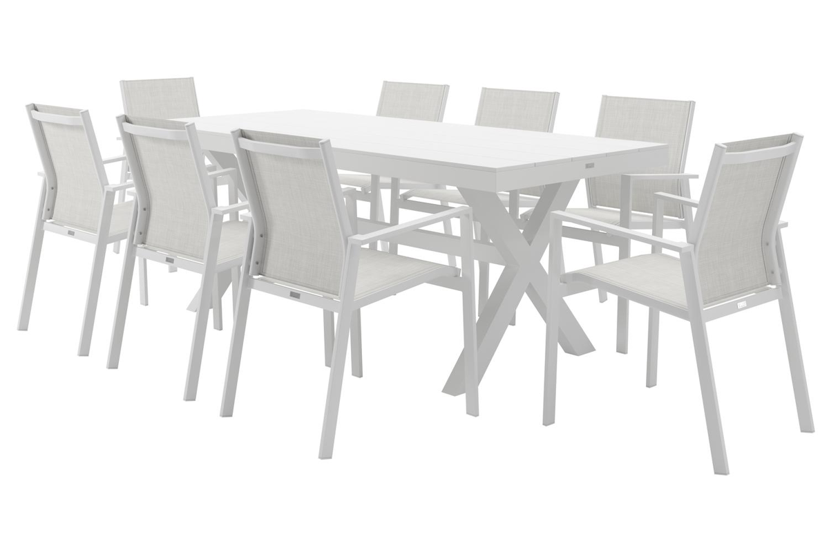 Ensemble de jardin Bahia est reconnaissable à son look solide et son piètement croisé. L’armature sur laquelle repose le plateau de table est robuste. Une barre traverse le milieu de la table comme soutien supplémentaire de l’armature.