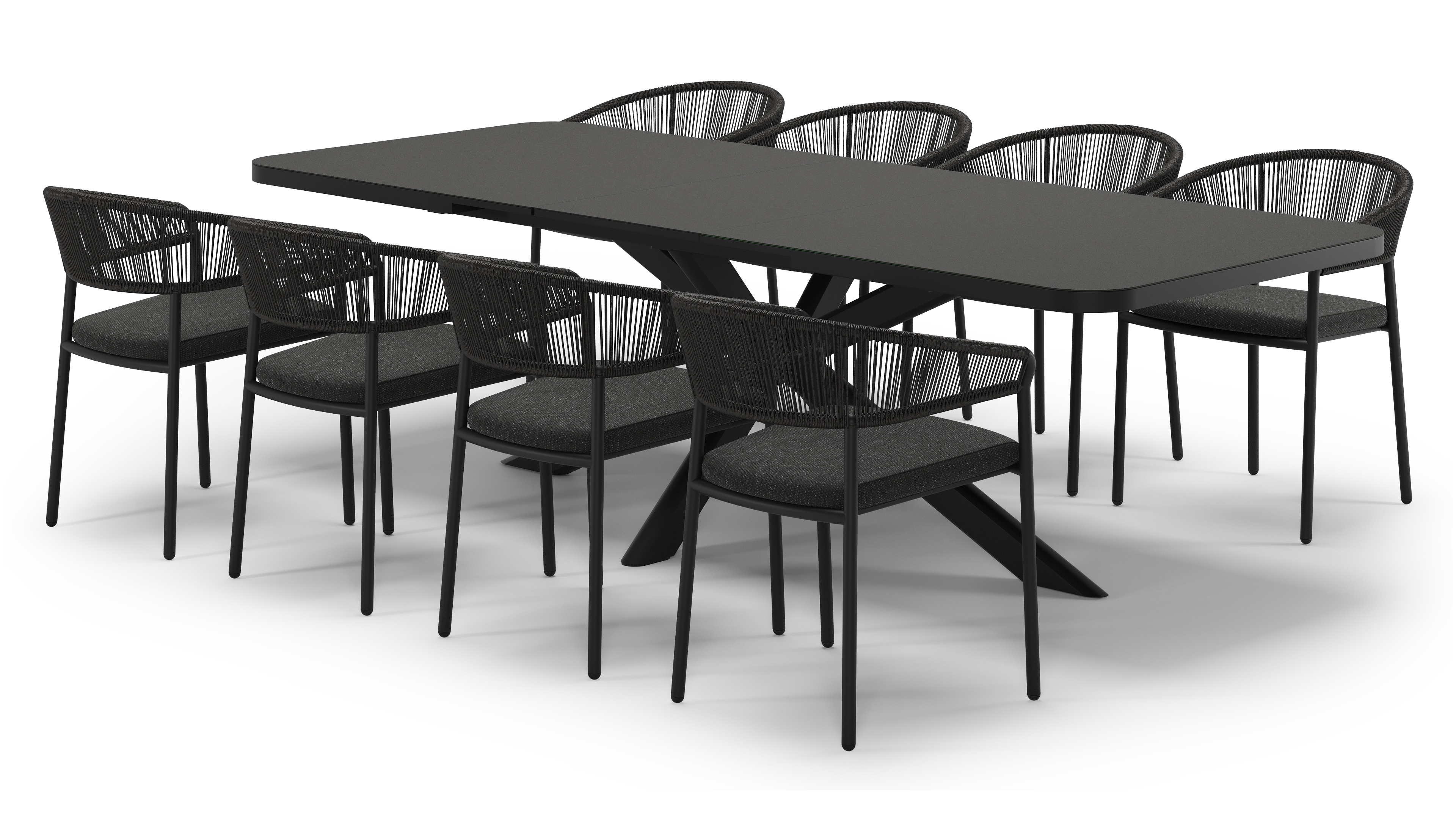 L'ensemble de jardin Estella se distingue par son piètement croisé dynamique qui lui confère un design moderne et affirmé. Grâce à son système extensible, vous créez facilement des places supplémentaires lorsque vous recevez des invités. L’armature de la table de jardin est fabriquée en aluminium inoxydable, un matériau solide mais léger, facile à déplacer. La surface est lisse, ce qui empêche la saleté d’adhérer et facilite l’entretien. Le revêtement en poudre assure la résistance aux UV et aux intempéries de votre mobilier. Un plateau de table de jardin en sintered stone contient différents types de minéraux cuits sous une pression encore plus élevée que la céramique, tout en offrant les mêmes propriétés. Le matériau est extrêmement solide. Il résiste au gel, à la chaleur et aux rayures, et se nettoie facilement.