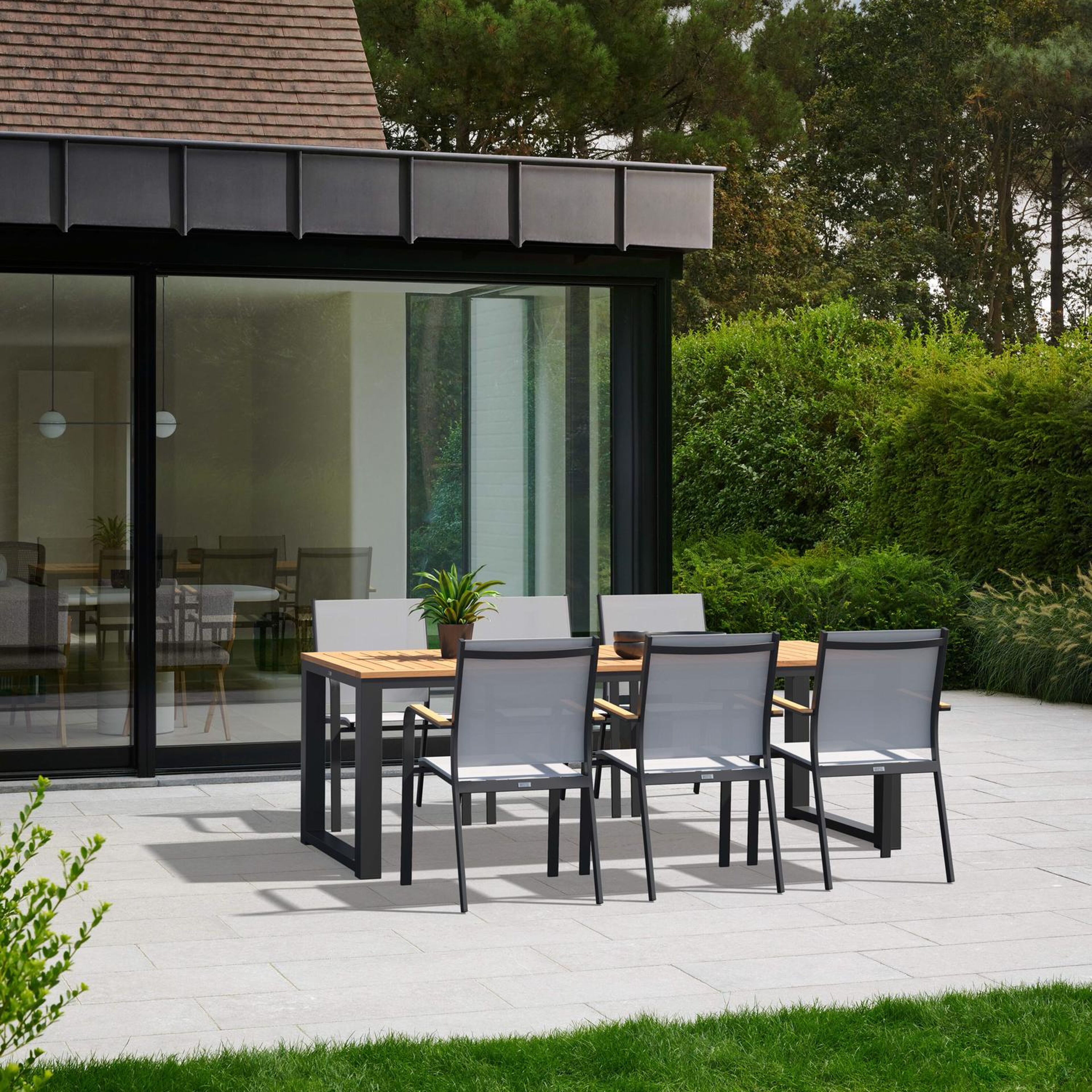 La chaise Amalfi est une chaise élégante aux accoudoirs arrondis et a un style naturel donné par ses accoudoirs en teck. La chaise Amalfi a un piètement en aluminium inoxydable. L’assise et le dossier sont en textilène solide, une matière élégante et facile d’entretien. Disponible dans différentes couleurs. La chaise est empilable et est donc facile à ranger.Passez des moments inoubliables à l’extérieur avec Ensemble de jardin Livo de qualité.