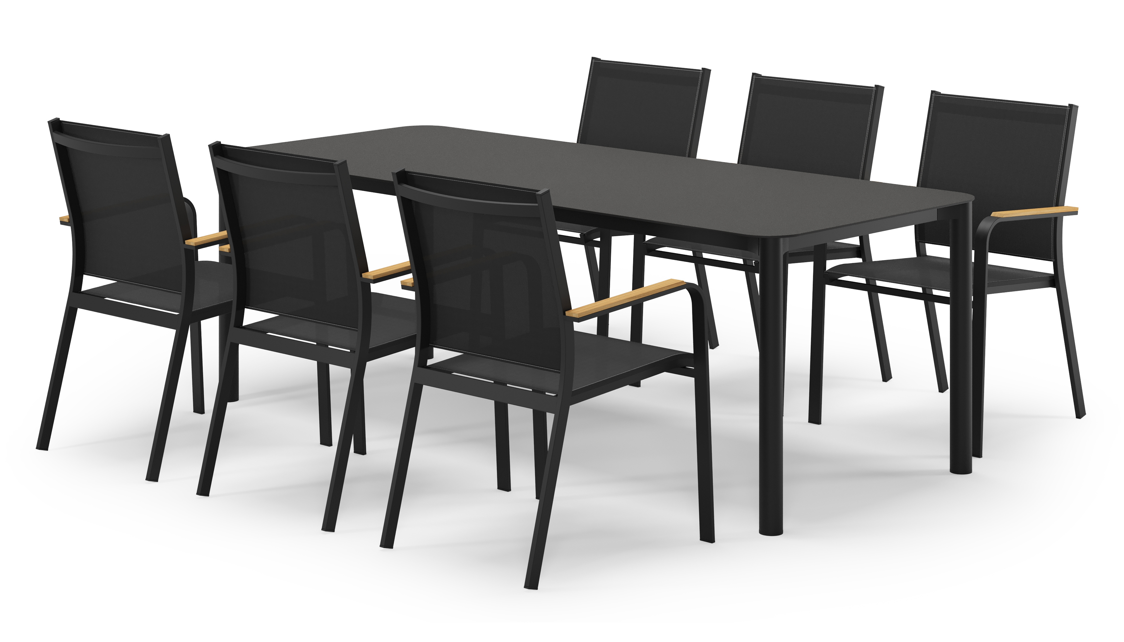 L'ensemble de jardin Mira est un complément élégant pour votre espace extérieur. Les pieds arrondis et le plateau rectangulaire arrondi confèrent à la table un design contemporain.