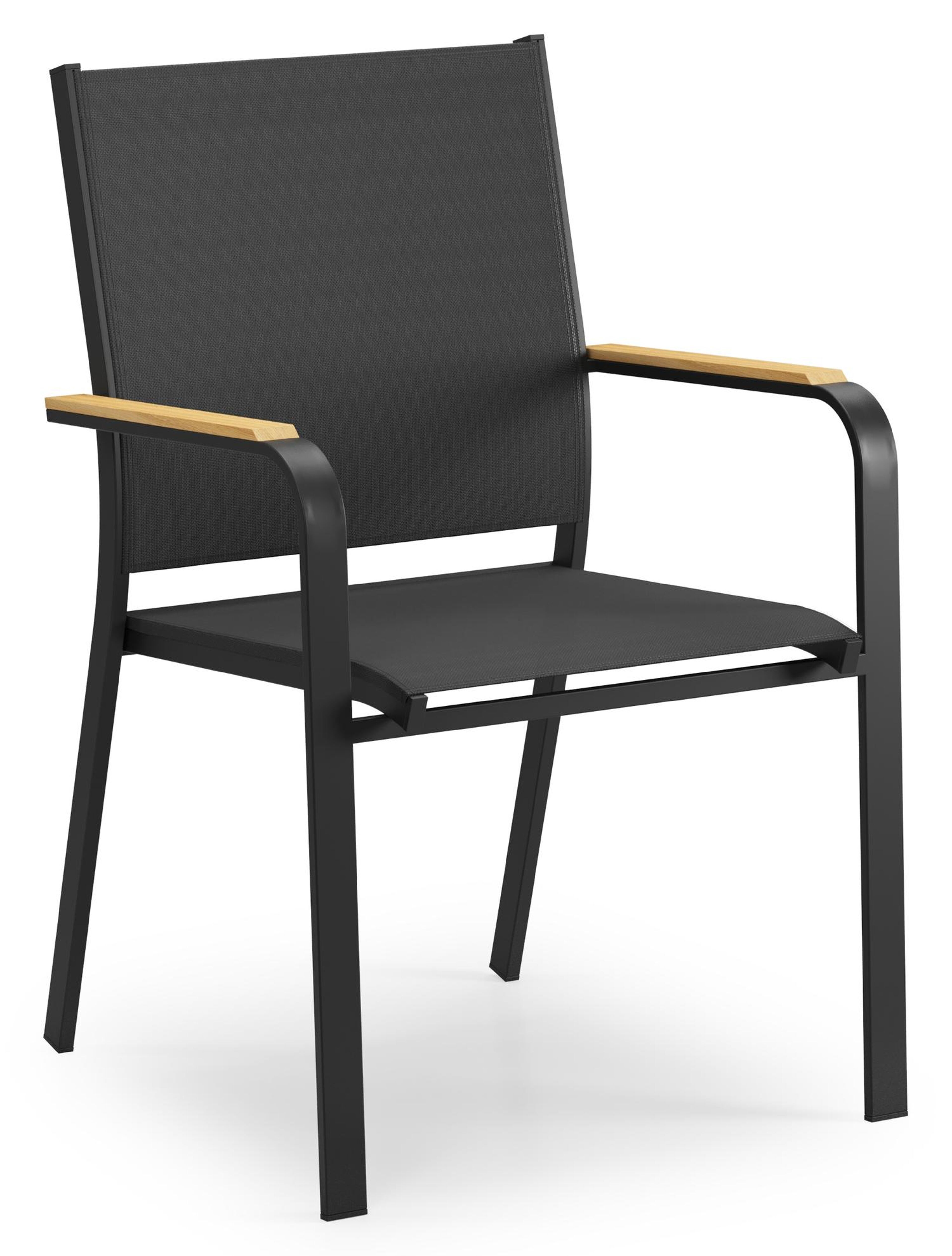 La chaise Amalfi est une chaise élégante aux accoudoirs arrondis et a un style naturel donné par ses accoudoirs en teck. La chaise Amalfi a un piètement en aluminium inoxydable. L’assise et le dossier sont en textilène solide, une matière élégante et facile d’entretien. Disponible dans différentes couleurs. La chaise est empilable et est donc facile à ranger.
