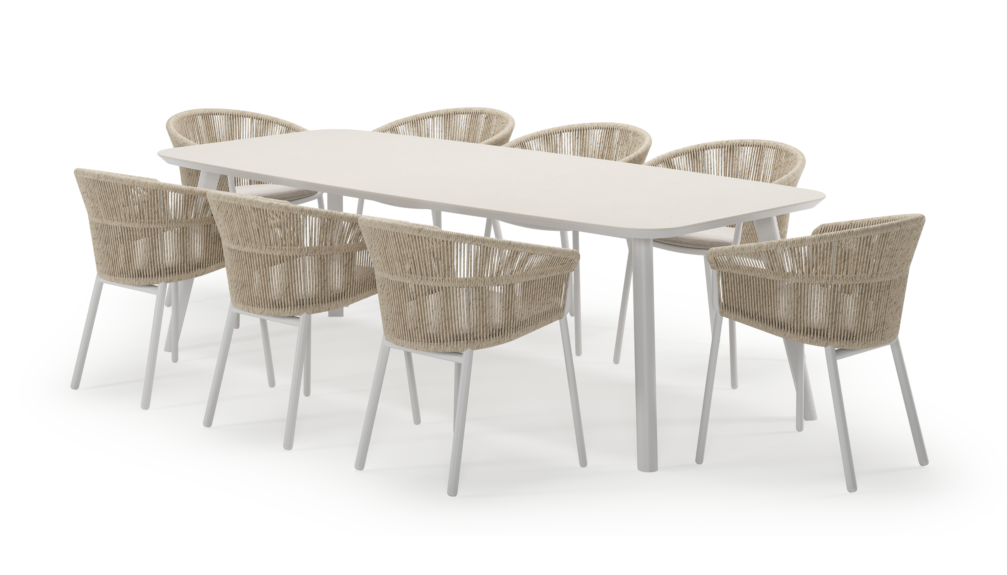 L'ensemble de jardin Mosa est facilement reconnaissable à son plateau rectangulaire arrondi et à ses pieds biseautés vers l'extérieur. La table a un aspect moderne avec une touche d'élégance.