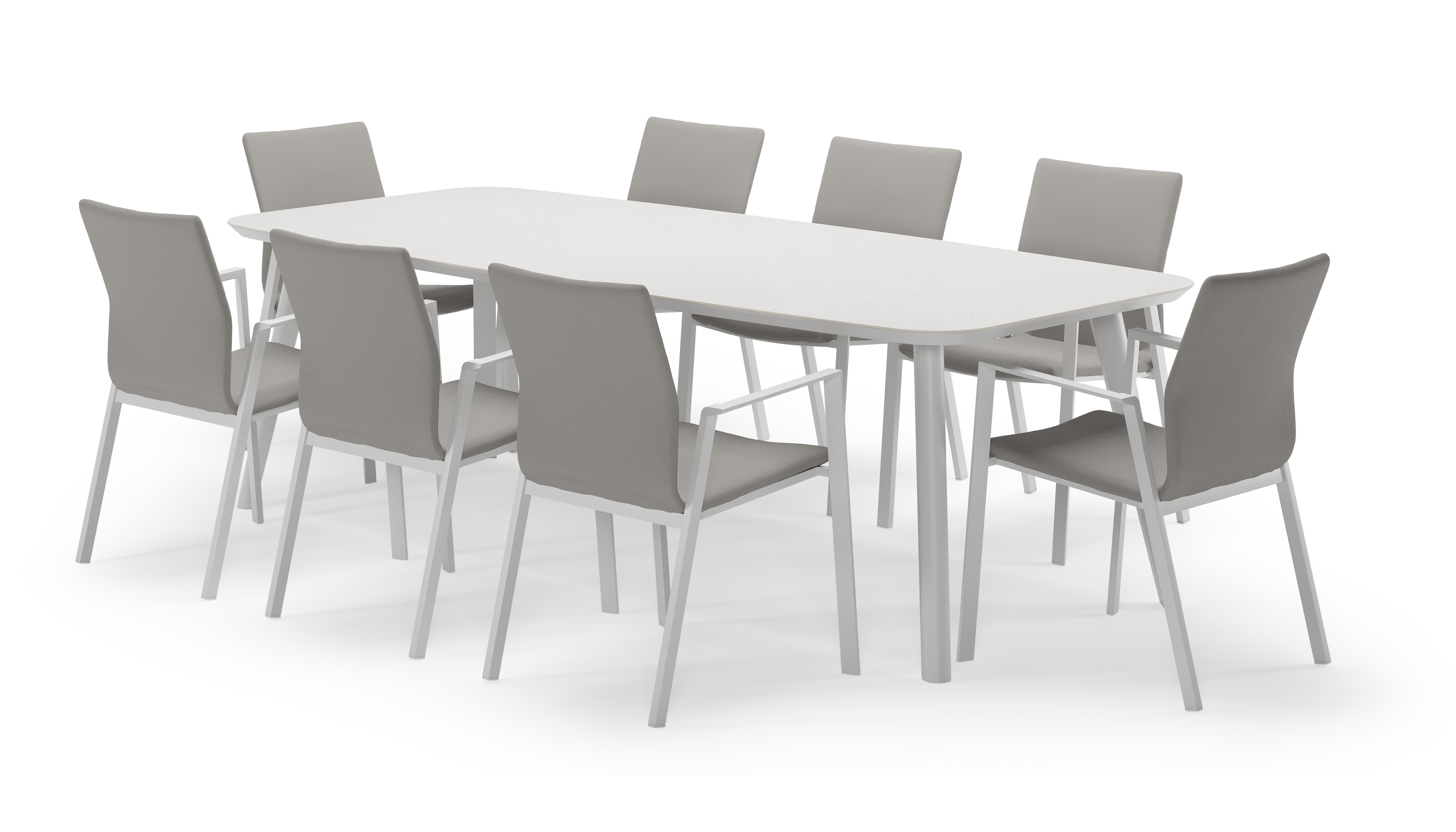 Mosa ensemble de jardin forme de bateau en aluminium blanc en sintered stone topo minerale avec 8 chaises de jardin Madura | Exterioo mobilier de jardin