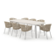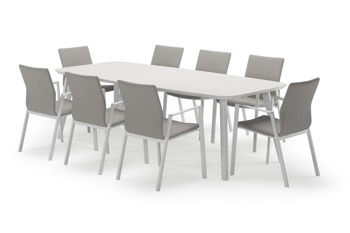 L'ensemble de jardin Mosa est facilement reconnaissable à son plateau rectangulaire arrondi et à ses pieds biseautés vers l'extérieur. La table a un aspect moderne avec une touche d'élégance.