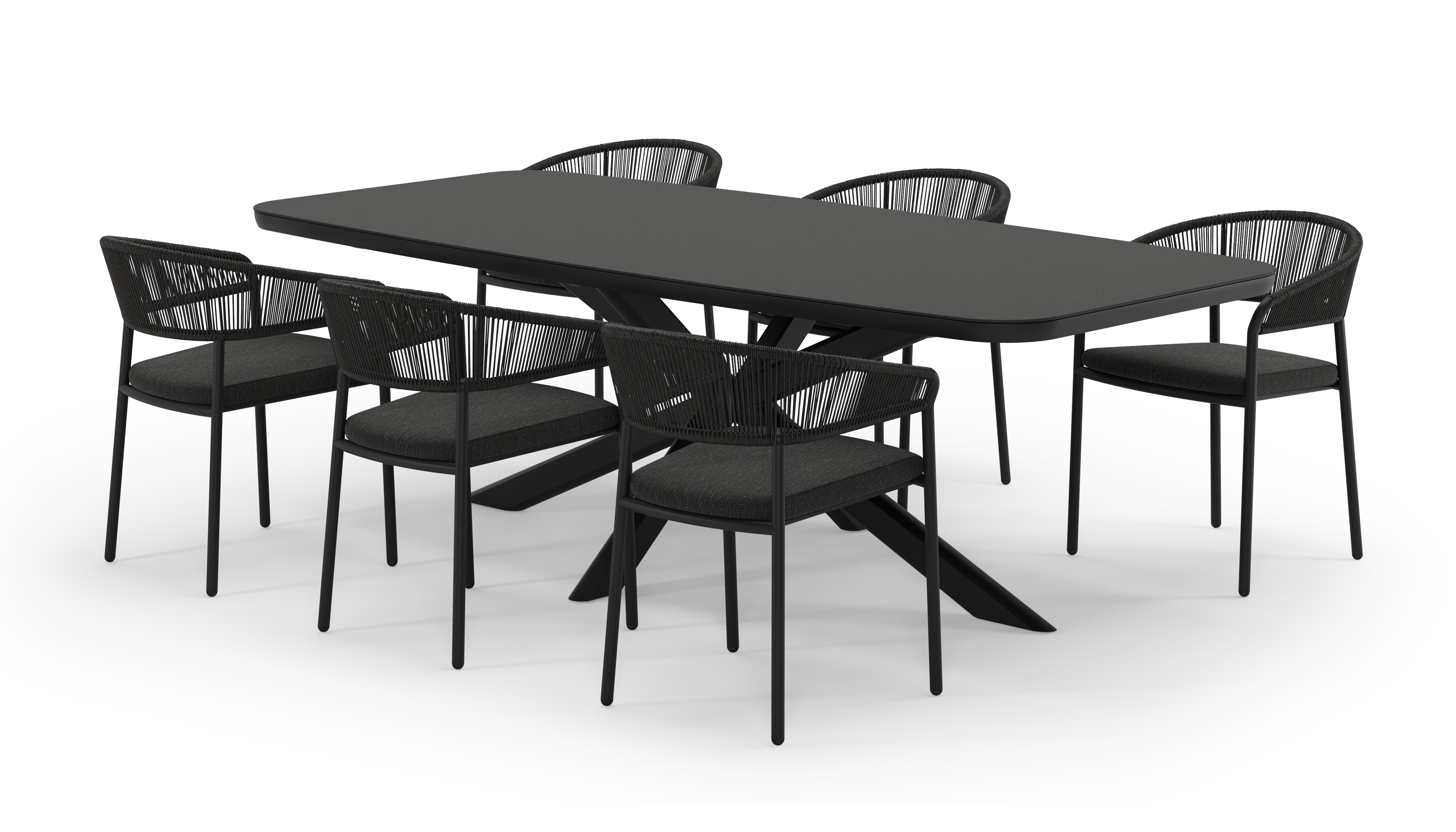 L'ensemble de jardin Pamplona offre un aspect contemporain et robuste grâce à sa forme arrondie et à ses pieds croisés remarquables. Cet ensemble de jardin est idéal pour une grande réception.