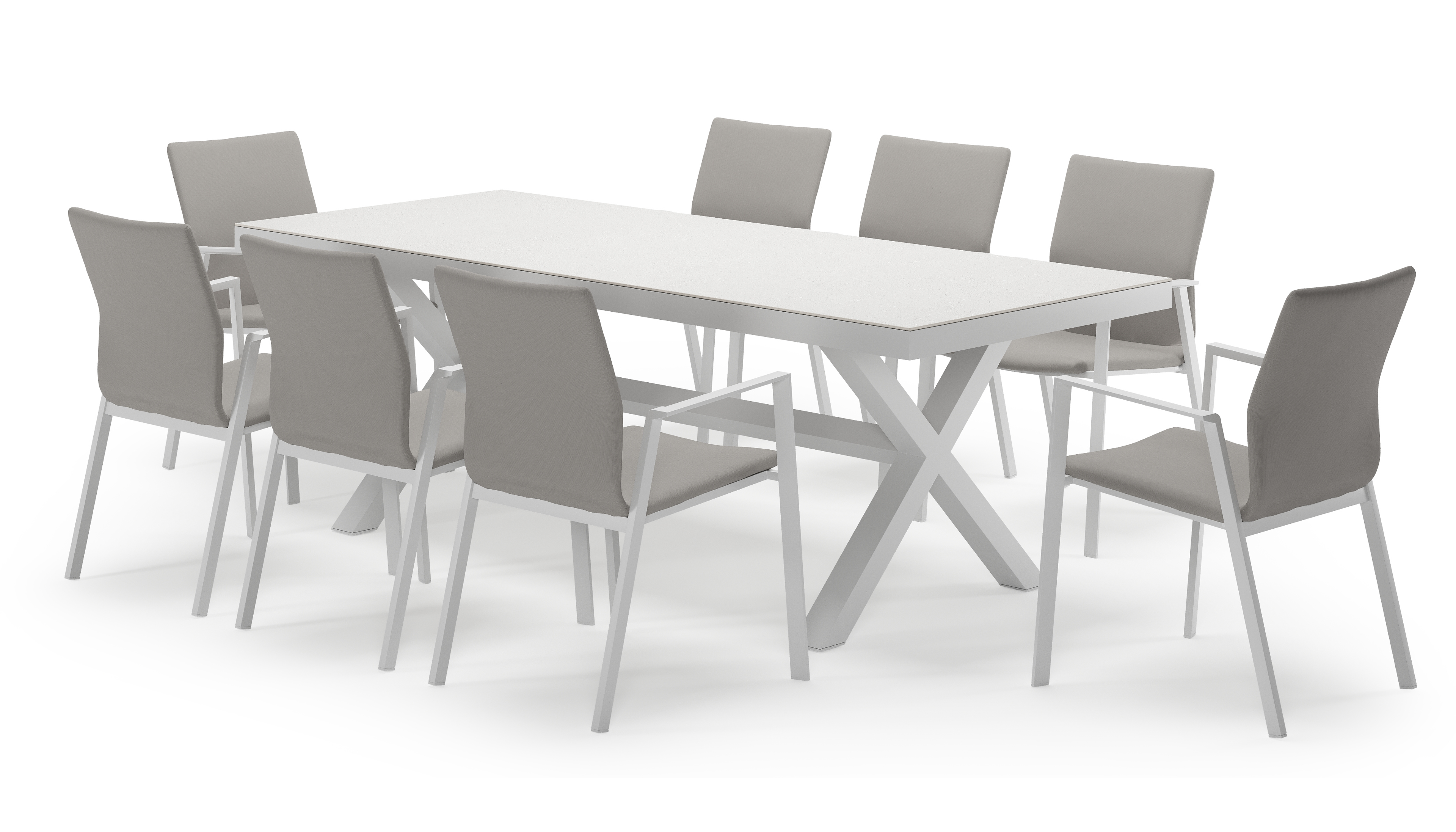L'ensemble de jardin Reza a un piètement croisé exceptionnel et un cadre solide et épais entourant le plateau de table. Une barre traverse le milieu de la table comme soutien supplémentaire de l’armature.