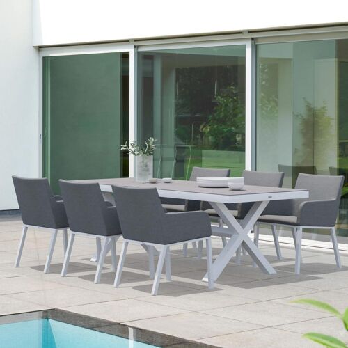 L’armature de la table est en aluminium inoxydable, un matériau robuste mais léger, qui est facile à déplacer. La surface présente une finition lisse, de sorte qu’elle n’attire pas la saleté et est facile à entretenir. Le revêtement poudré garantit la résistance aux UV et aux intempéries de votre meuble.