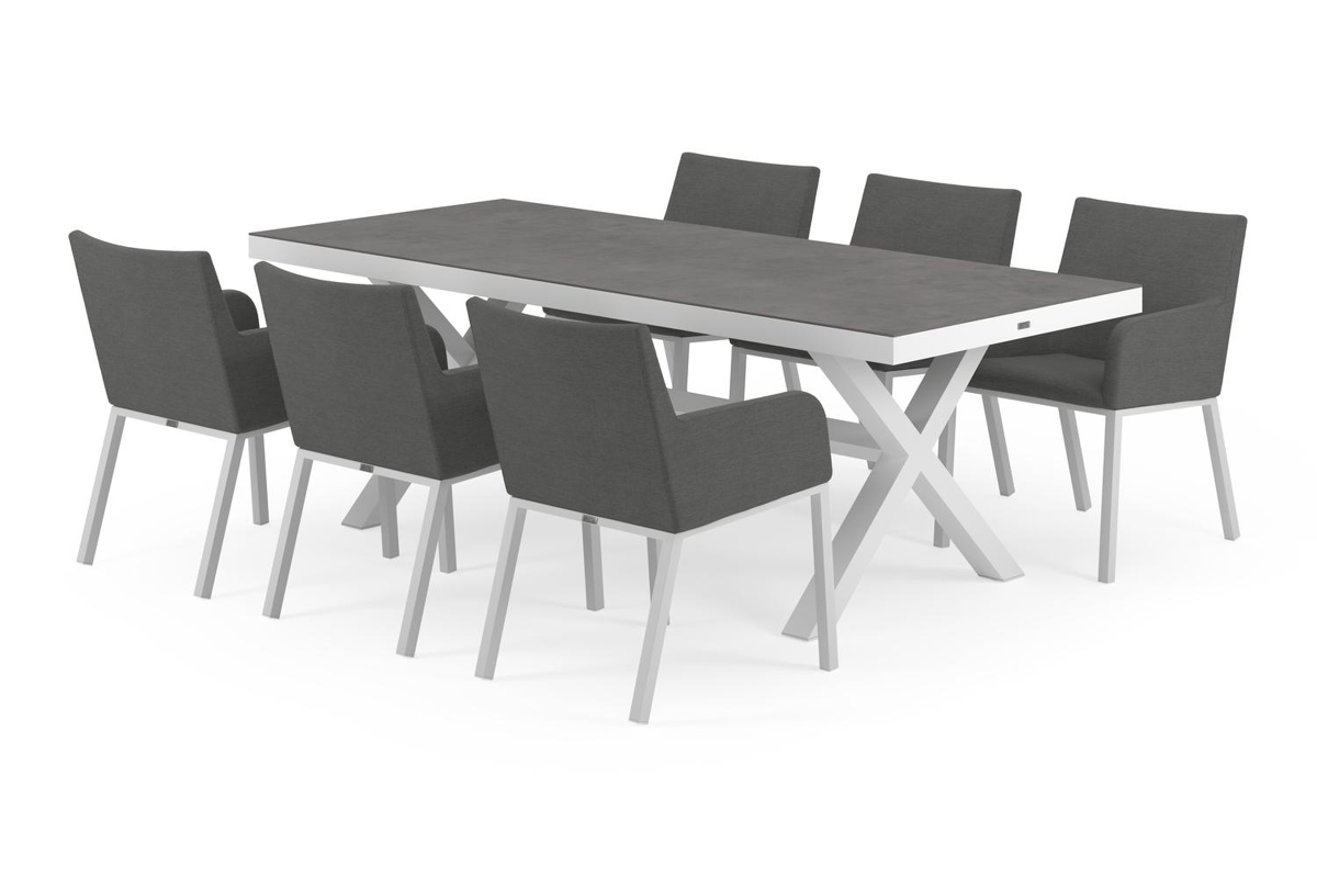 Ensemble de jardin Reza a un piètement croisé exceptionnel et un cadre solide et épais entourant le plateau de table. Une barre traverse le milieu de la table comme soutien supplémentaire de l’armature.