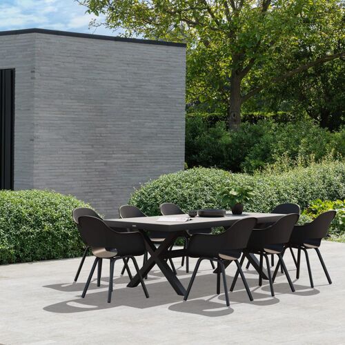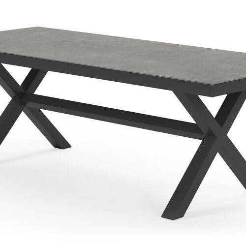 Ensemble de jardin Reza a un piètement croisé exceptionnel et un cadre solide et épais entourant le plateau de table. Une barre traverse le milieu de la table comme soutien supplémentaire de l’armature.