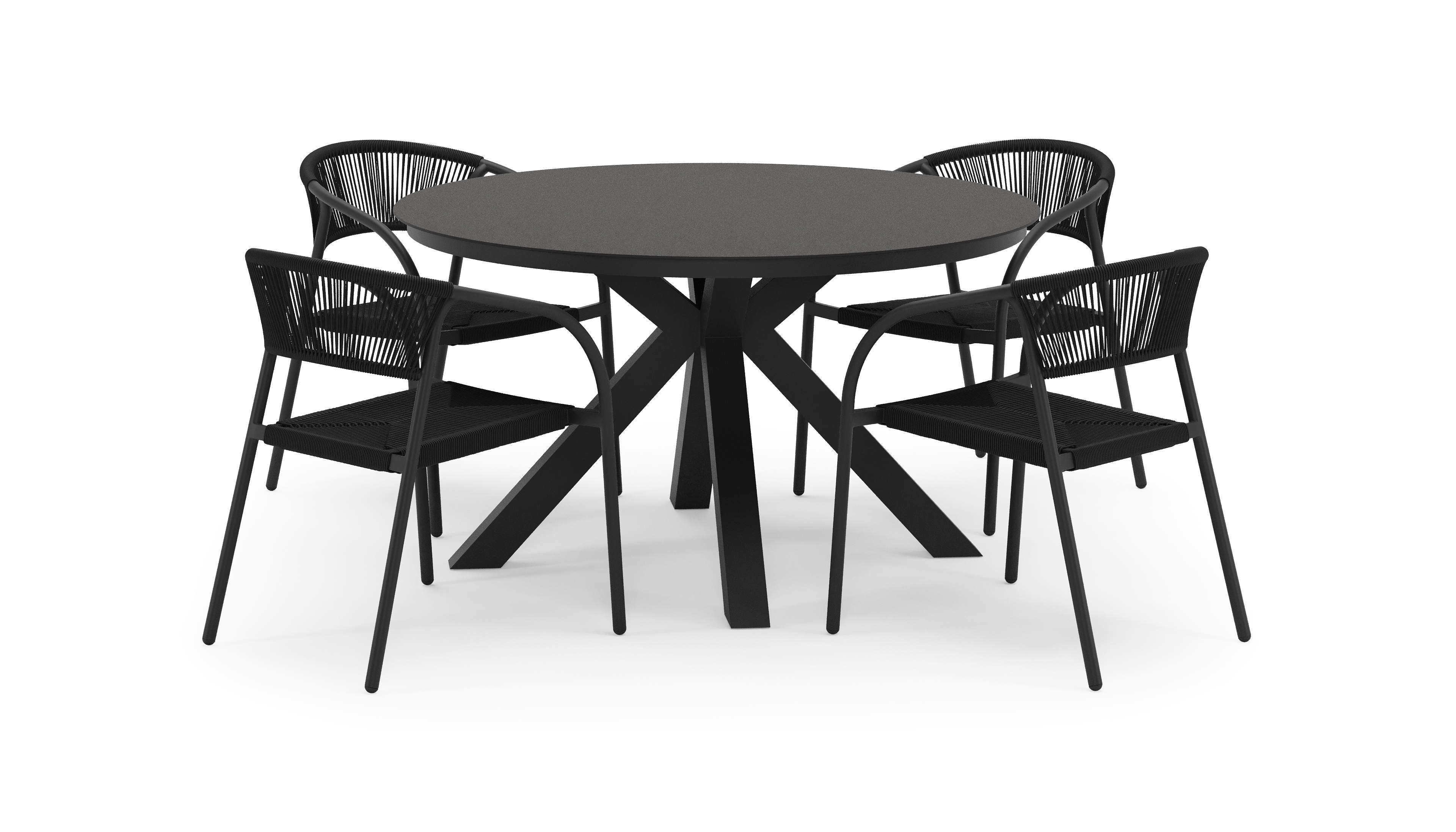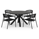 La table de jardin Tora est une collection de tables rondes. Le piètement croisé caractéristique se sépare sous le cadre en quatre pieds espacés, ce qui apporte plus de stabilité.