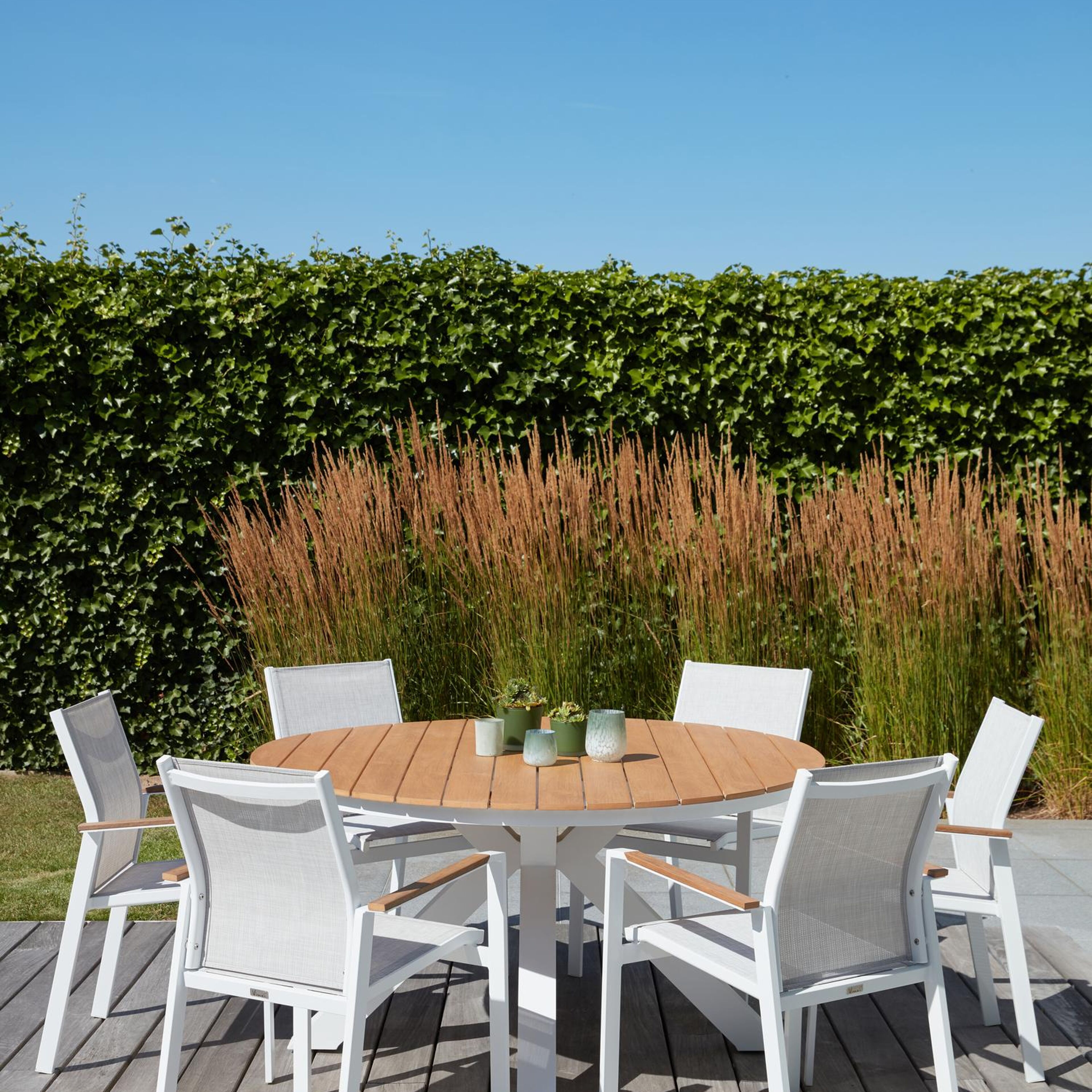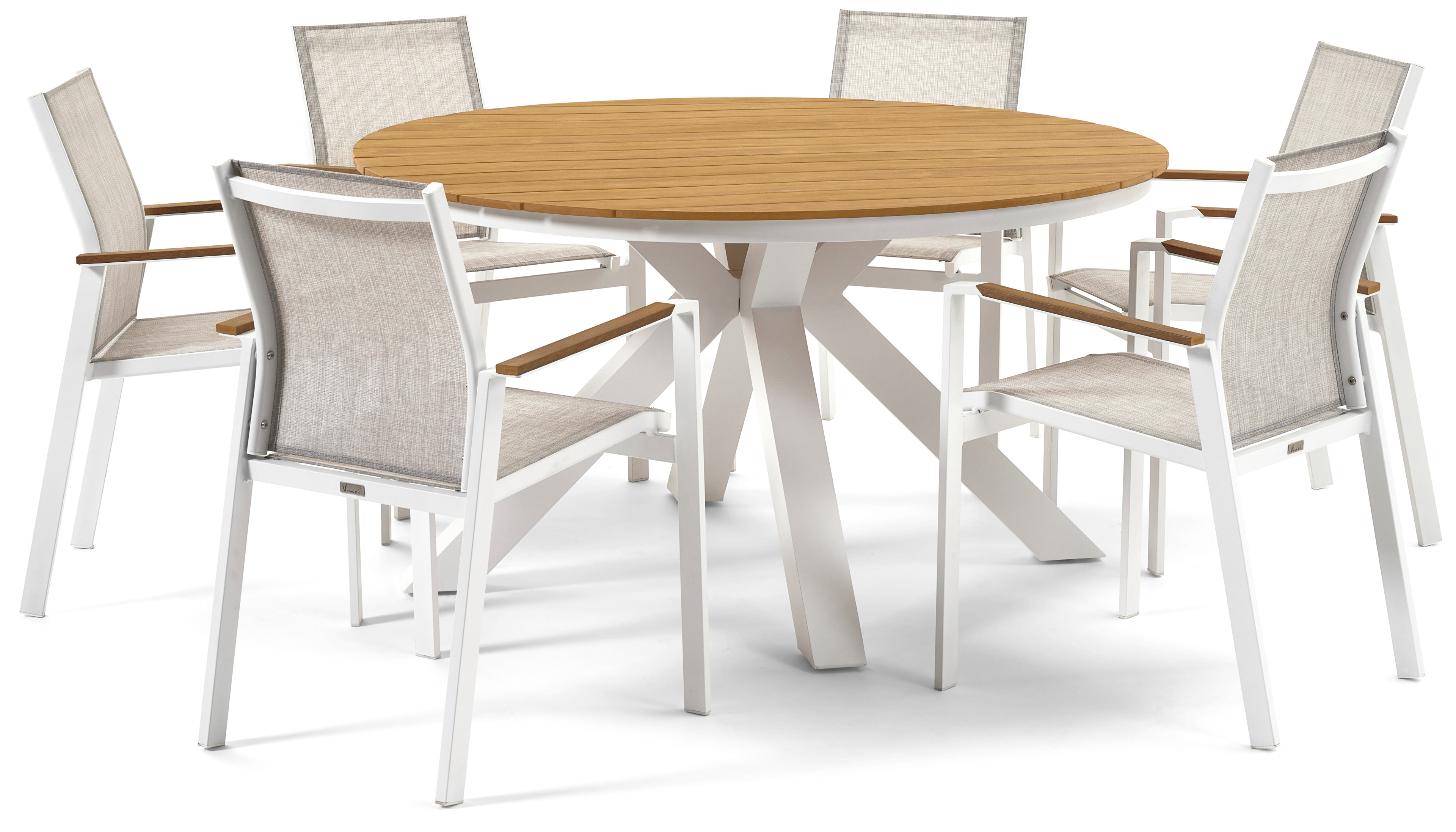 Ensemble de jardin Tora est une collection de tables rondes. Le piètement croisé caractéristique se sépare sous le cadre en quatre pieds espacés, ce qui apporte plus de stabilité.