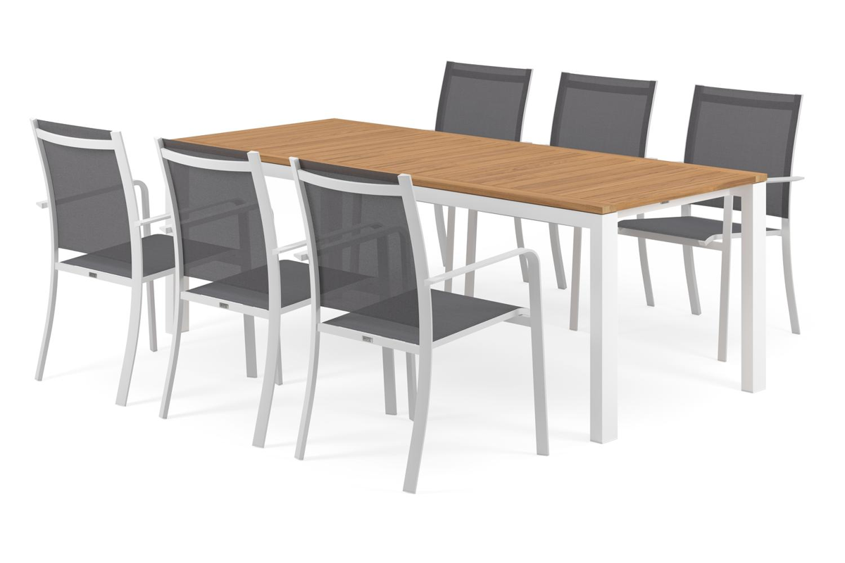 Ensemble de jardin Trente en aluminium blanc avec plateau de table en teck naturel et 6 chaises de jardin empilables Calobra | Exterioo