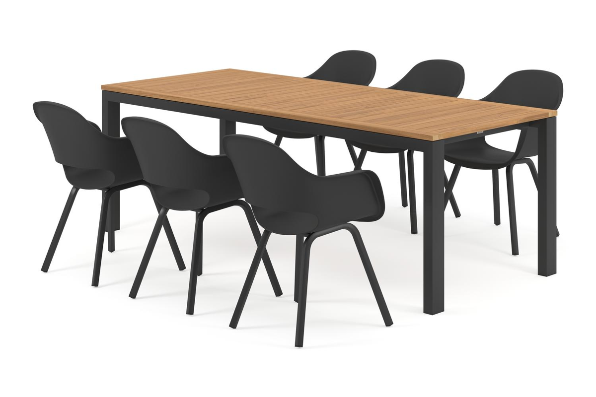 Ensemble de jardin Trente a un style élégant avec un cadre qui fait pour ainsi dire flotter le plateau de table. Grâce à la position plus en retrait des pieds, vous pouvez placer une chaise de plus à chaque extrémité. Les pieds de table solides apportent la touche finale.
