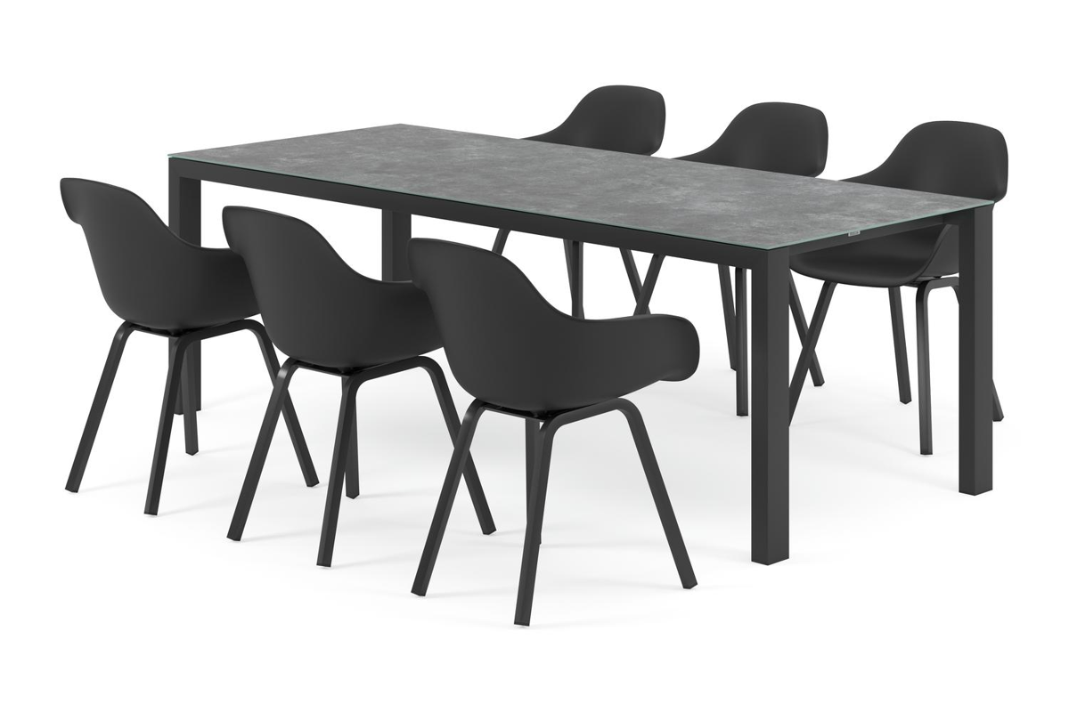 Ensemble de jardin Trente a un style élégant avec un cadre qui fait pour ainsi dire flotter le plateau de table. Grâce à la position plus en retrait des pieds, vous pouvez placer une chaise de plus à chaque extrémité. Les pieds de table solides apportent la touche finale. L’armature de la table est en aluminium inoxydable, un matériau robuste mais léger, qui est facile à déplacer. La surface présente une finition lisse, de sorte qu’elle n’attire pas la saleté et est facile à entretenir. Le revêtement poudré garantit la résistance aux UV et aux intempéries de votre meuble.