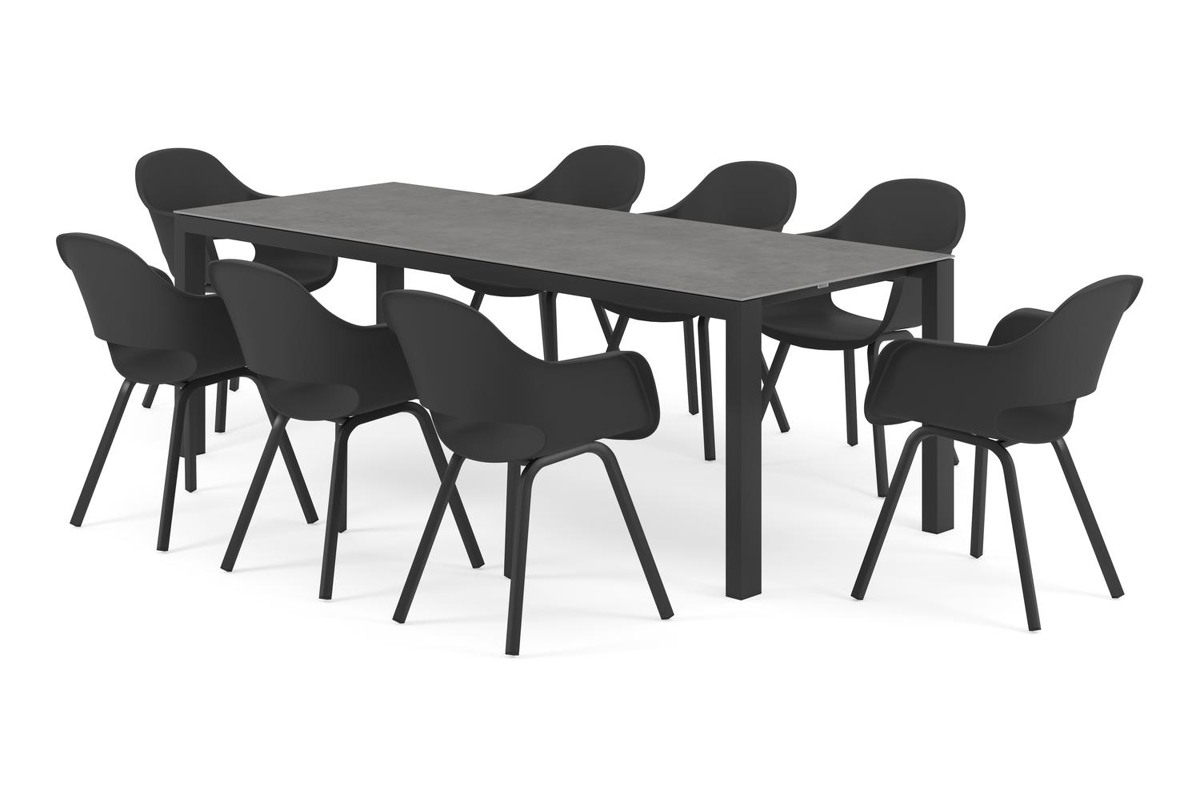 Ensemble de jardin Trente a un style élégant avec un cadre qui fait pour ainsi dire flotter le plateau de table. Grâce à la position plus en retrait des pieds, vous pouvez placer une chaise de plus à chaque extrémité. Les pieds de table solides apportent la touche finale.