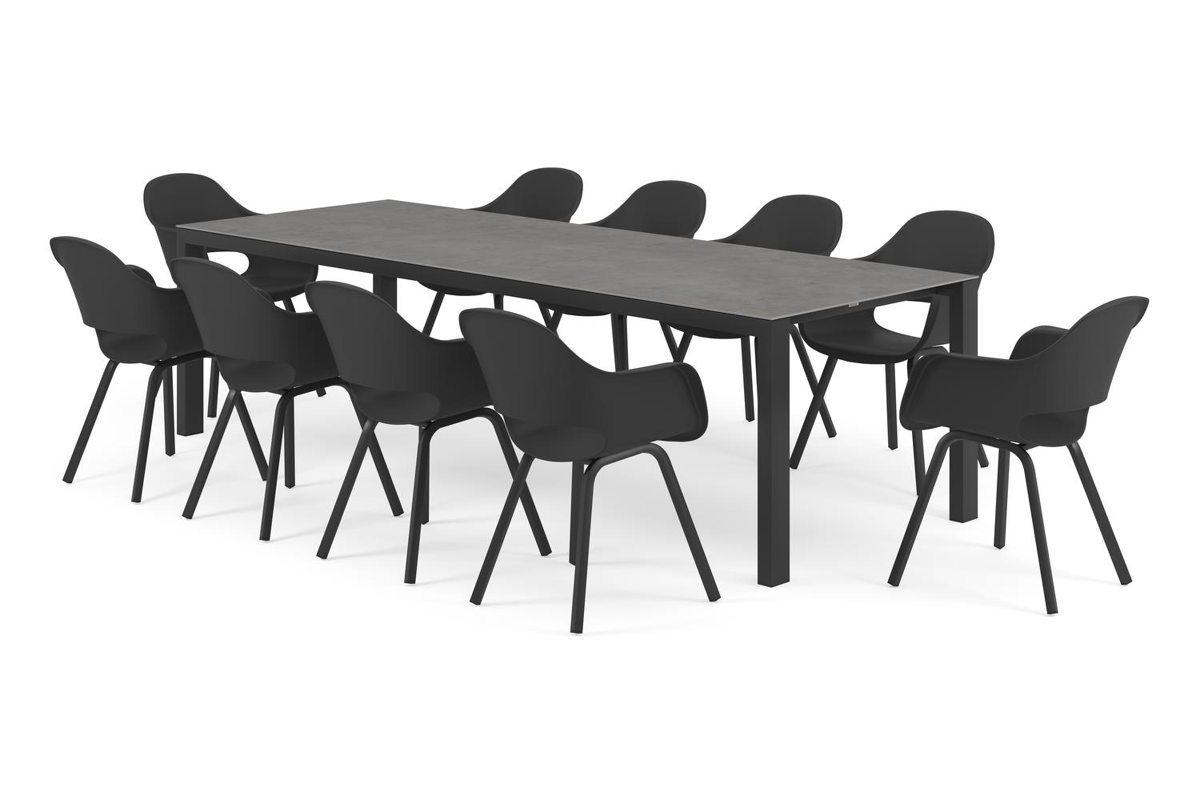 Ensemble de jardin Trente a un style élégant avec un cadre qui fait pour ainsi dire flotter le plateau de table. Grâce à la position plus en retrait des pieds, vous pouvez placer une chaise de plus à chaque extrémité. Les pieds de table solides apportent la touche finale.