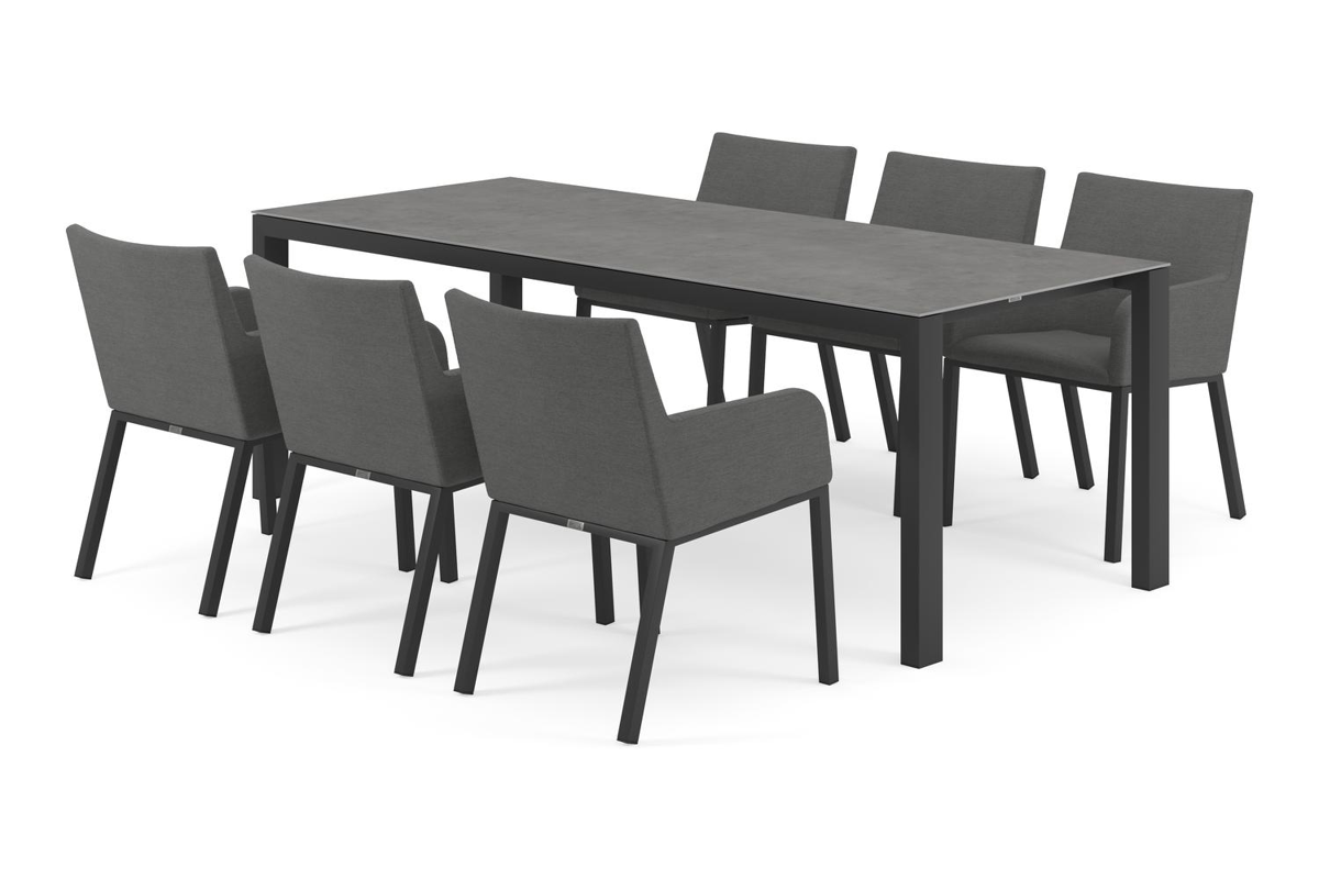 Ensemble de jardin Trente a un style élégant avec un cadre qui fait pour ainsi dire flotter le plateau de table. Grâce à la position plus en retrait des pieds, vous pouvez placer une chaise de plus à chaque extrémité. Les pieds de table solides apportent la touche finale.