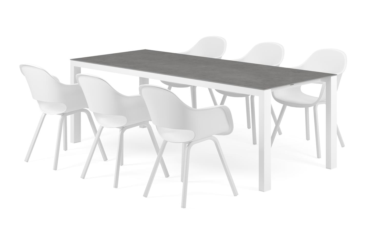 Ensemble de jardin Trente a un style élégant avec un cadre qui fait pour ainsi dire flotter le plateau de table. Grâce à la position plus en retrait des pieds, vous pouvez placer une chaise de plus à chaque extrémité. Les pieds de table solides apportent la touche finale.