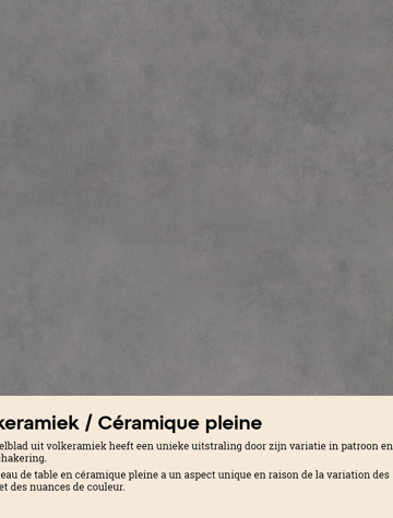 Un plateau de table entièrement en céramique consiste en une plaque en céramique qui est cuite à une température extrêmement élevée. Ce matériau est très solide et résiste aux coups. Un plateau de table entièrement en céramique résiste au gel, à la chaleur et aux rayures, et est facile à nettoyer.