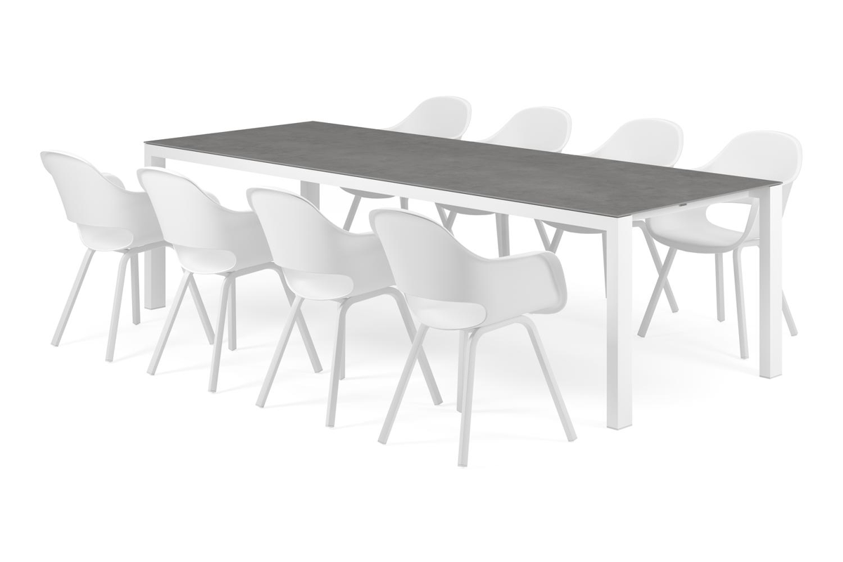 Ensemble de jardin Trente a un style élégant avec un cadre qui fait pour ainsi dire flotter le plateau de table. Grâce à la position plus en retrait des pieds, vous pouvez placer une chaise de plus à chaque extrémité. Les pieds de table solides apportent la touche finale.