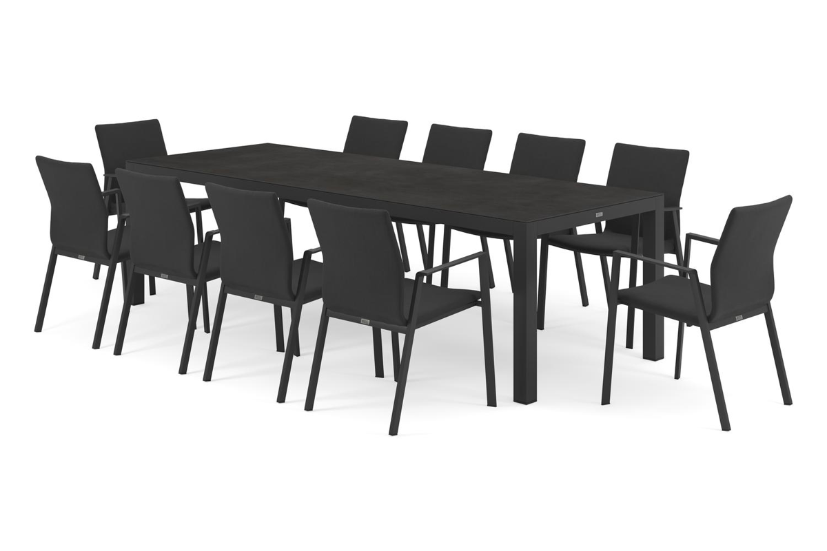 Un plateau de table entièrement en céramique consiste en une plaque en céramique qui est cuite à une température extrêmement élevée. Ce matériau est très solide et résiste aux coups. Un plateau de table entièrement en céramique résiste au gel, à la chaleur et aux rayures, et est facile à nettoyer.L'ensemble de jardin Madura a un design unique avec une armature continue. Tant les côtés que les pieds sont arrondis vers l’intérieur.