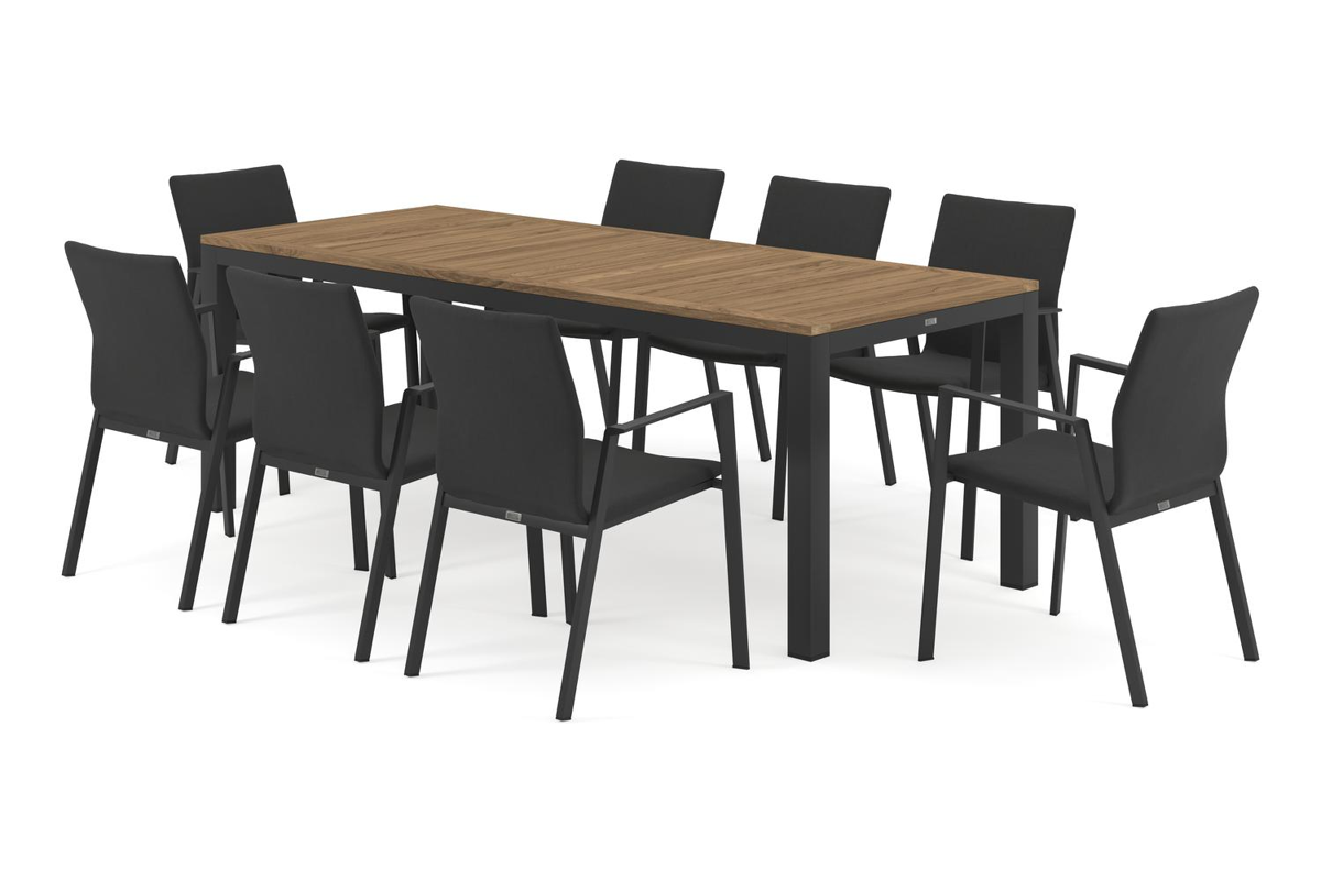 Un plateau de table en teck est synonyme de qualité exceptionnelle et de design naturel. Le teck est une essence de bois de qualité qui se caractérise par sa dureté. Étant donné que le bois vit, sa structure ou sa couleur peuvent légèrement différer de ce qui est présenté à l’image.L'ensemble de jardin Madura a un design unique avec une armature continue. Tant les côtés que les pieds sont arrondis vers l’intérieur.