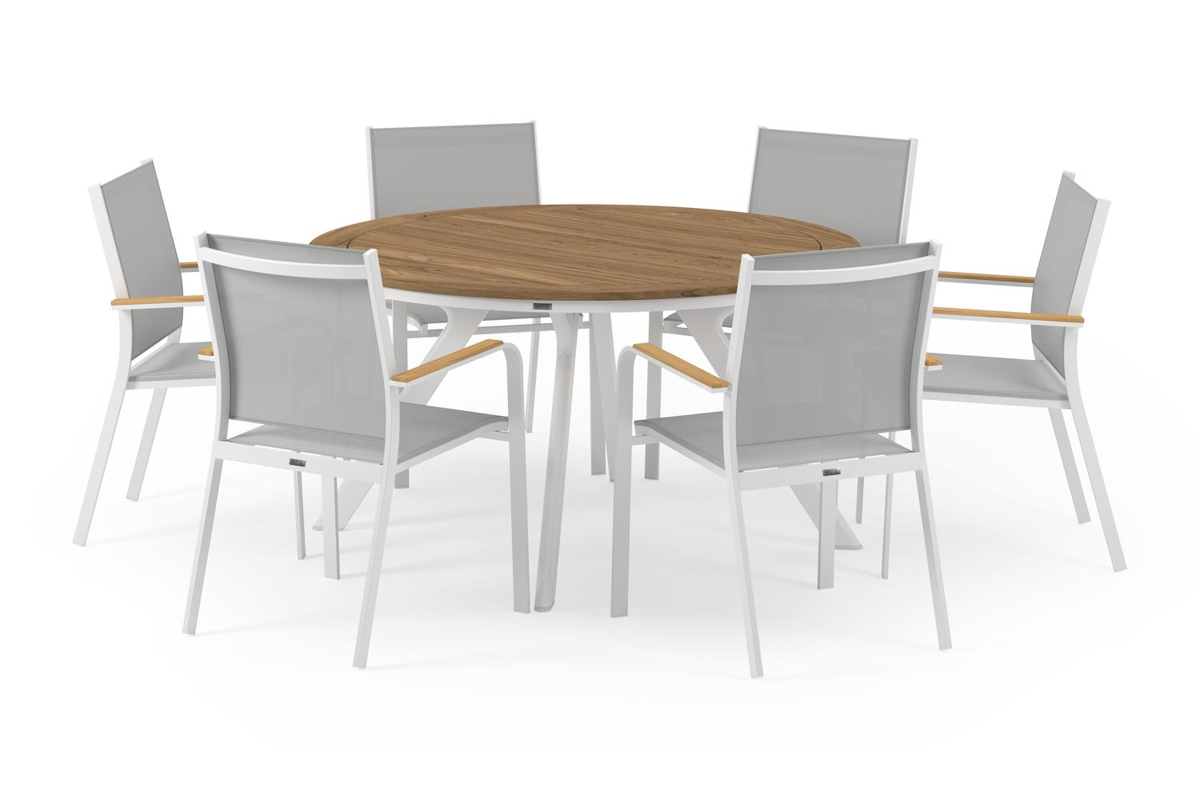 La chaise Amalfi est une chaise élégante aux accoudoirs arrondis et a un style naturel donné par ses accoudoirs en teck. La chaise Amalfi a un piètement en aluminium inoxydable. L’assise et le dossier sont en textilène solide, une matière élégante et facile d’entretien. Disponible dans différentes couleurs. La chaise est empilable et est donc facile à ranger.Passez des moments inoubliables à l’extérieur avec Ensemble de jardin Viaro de qualité.