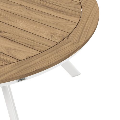 Ensemble de jardin Viaro a un plateau de table rond et un design épuré. La table est soutenue par quatre pieds espacés.