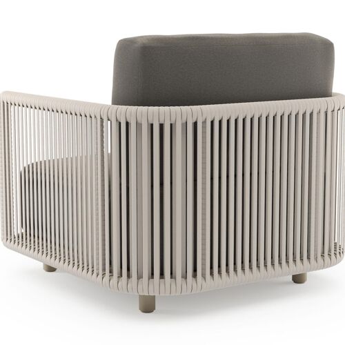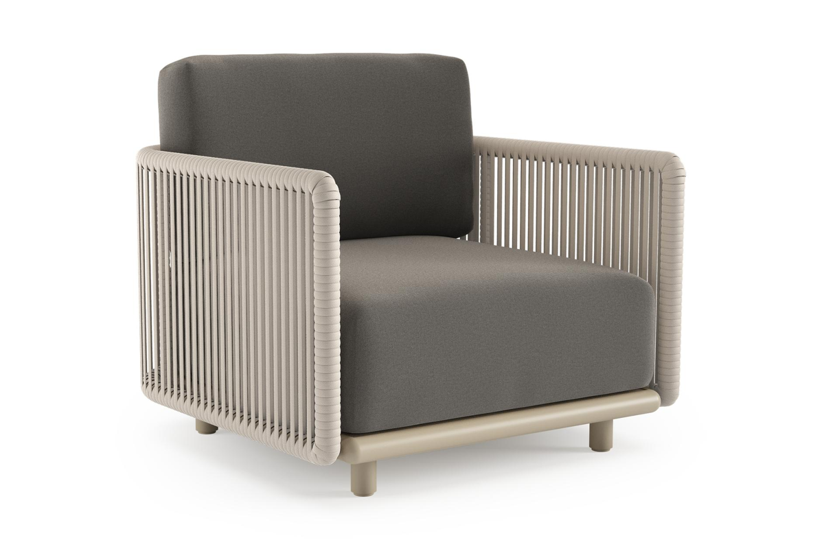Fauteuil de jardin Organo en aluminium beige et corde luxe plate tissée verticalement beige et coussin en all weather Sunbrella® luxe natte dark taupe | Exterioo
