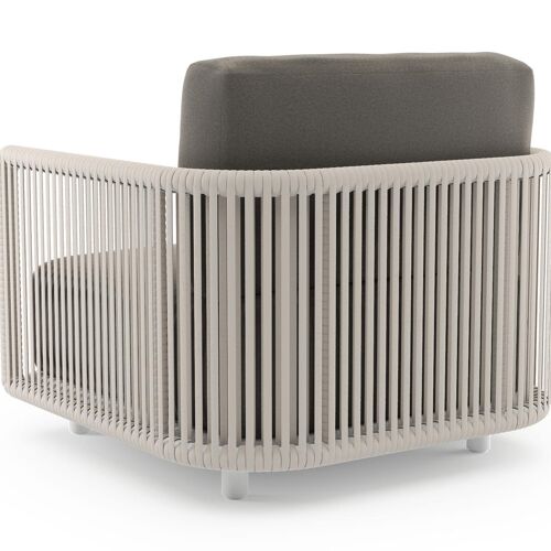 Fauteuil de jardin Organo en aluminium blanc et corde luxe plate tissée verticalement beige et coussin en all weather Sunbrella® luxe natte dark taupe | Exterioo