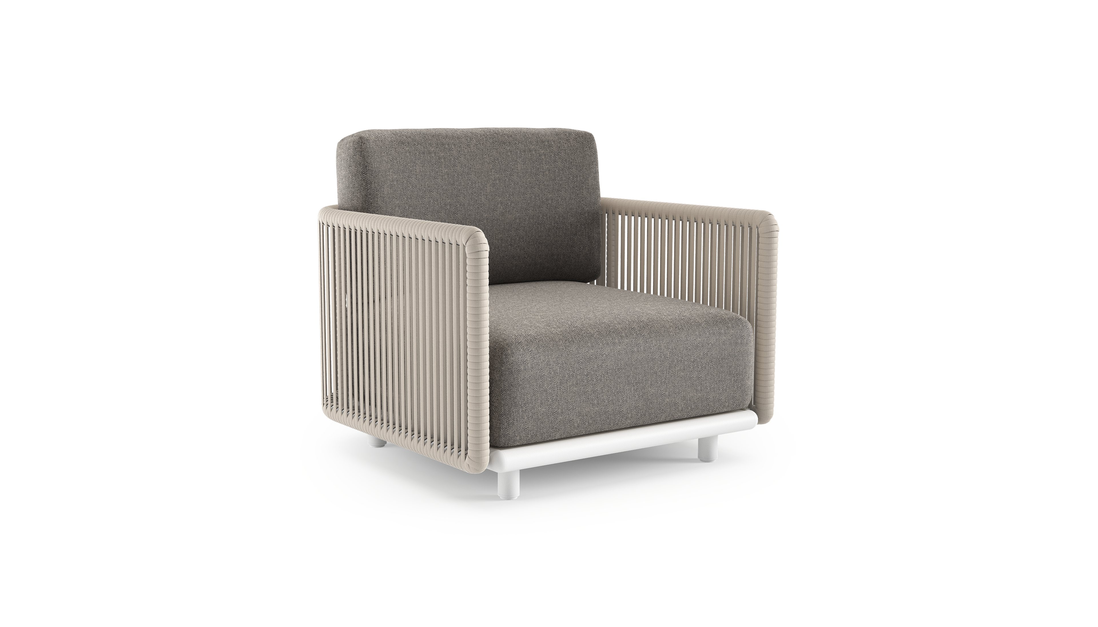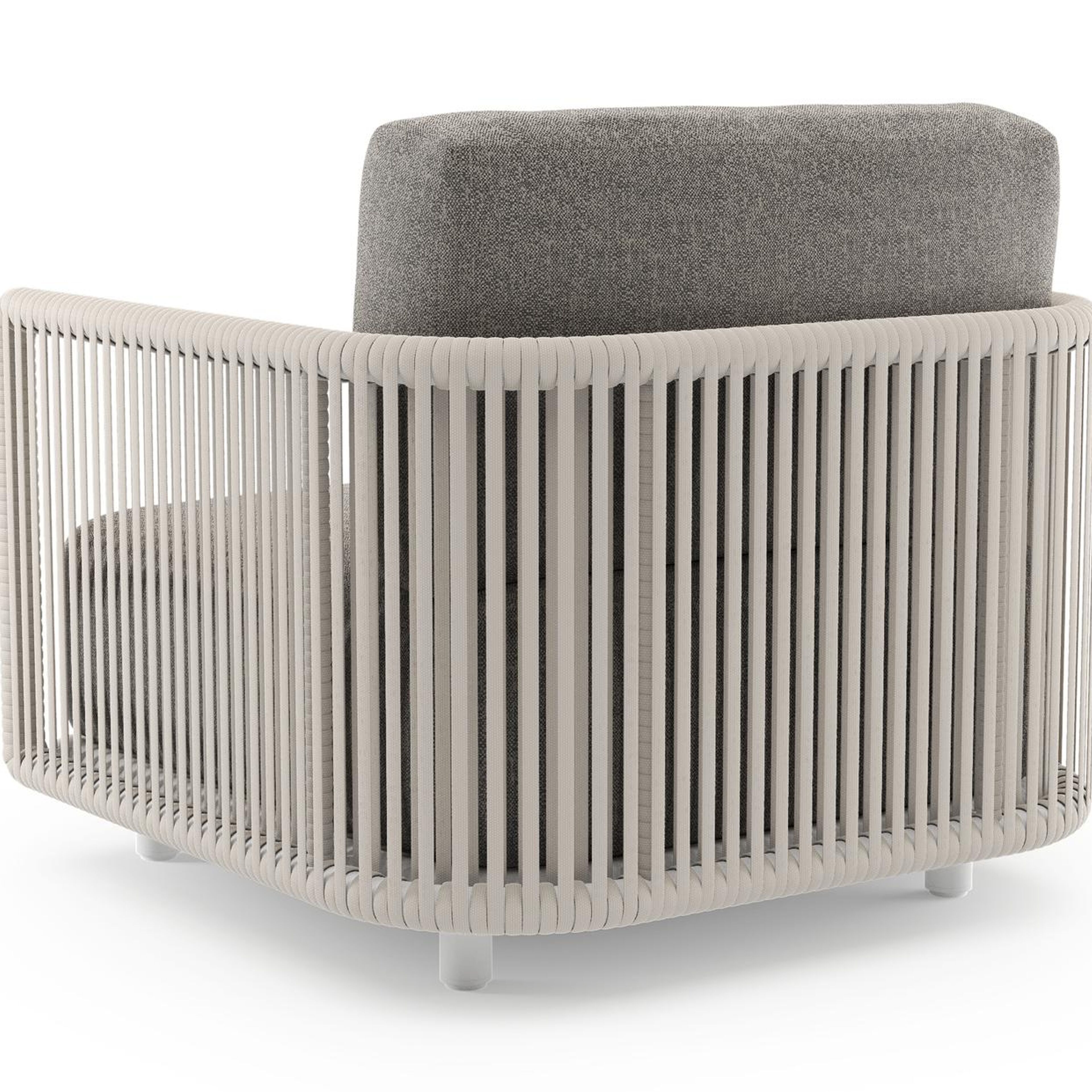 Fauteuil de jardin Organo en aluminium blanc et corde luxe plate tissée verticalement beige et coussin en all weather Sunbrella® luxe chartres drizzle | Exterioo mobilier de jardin