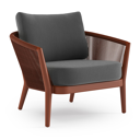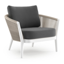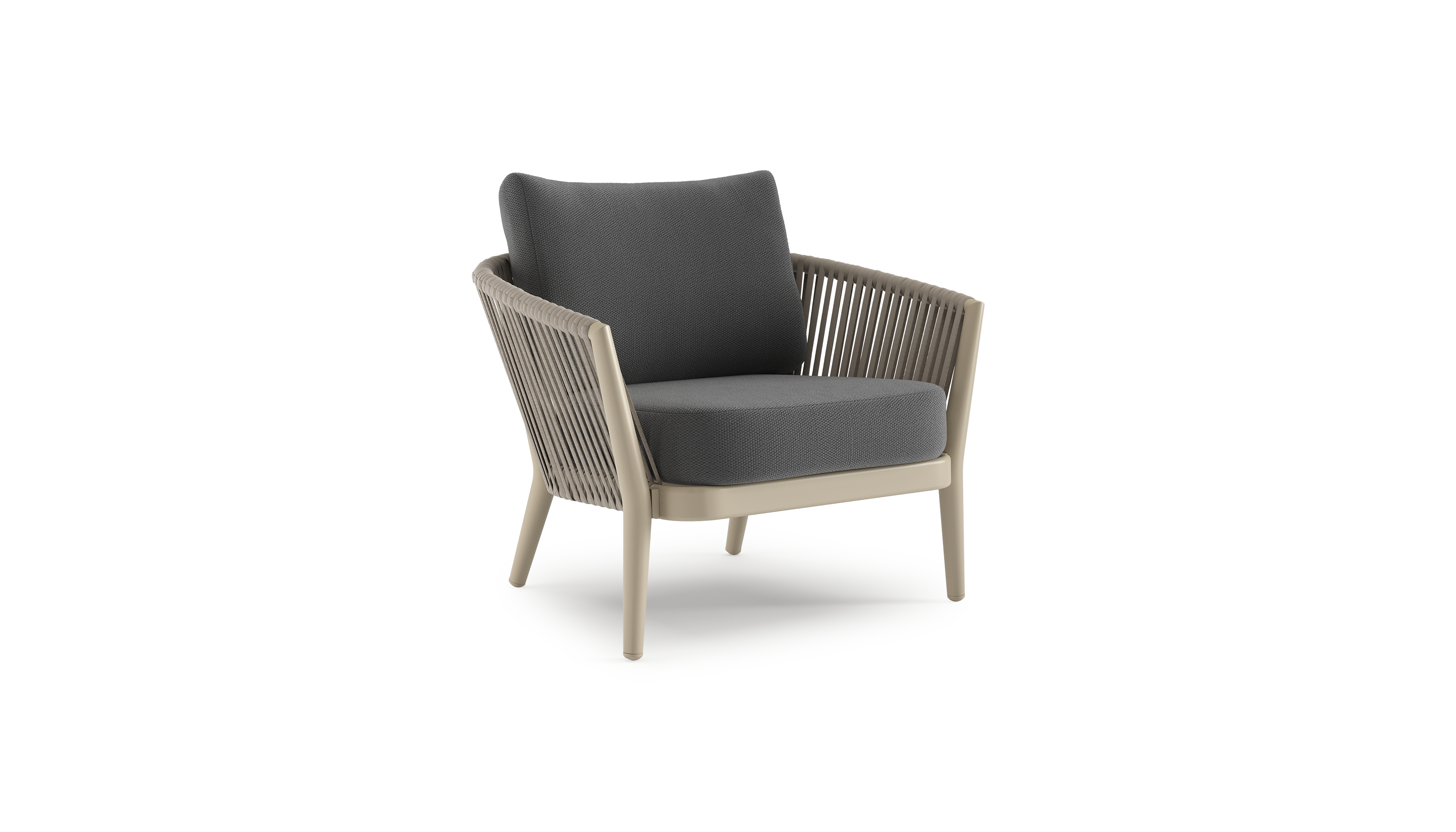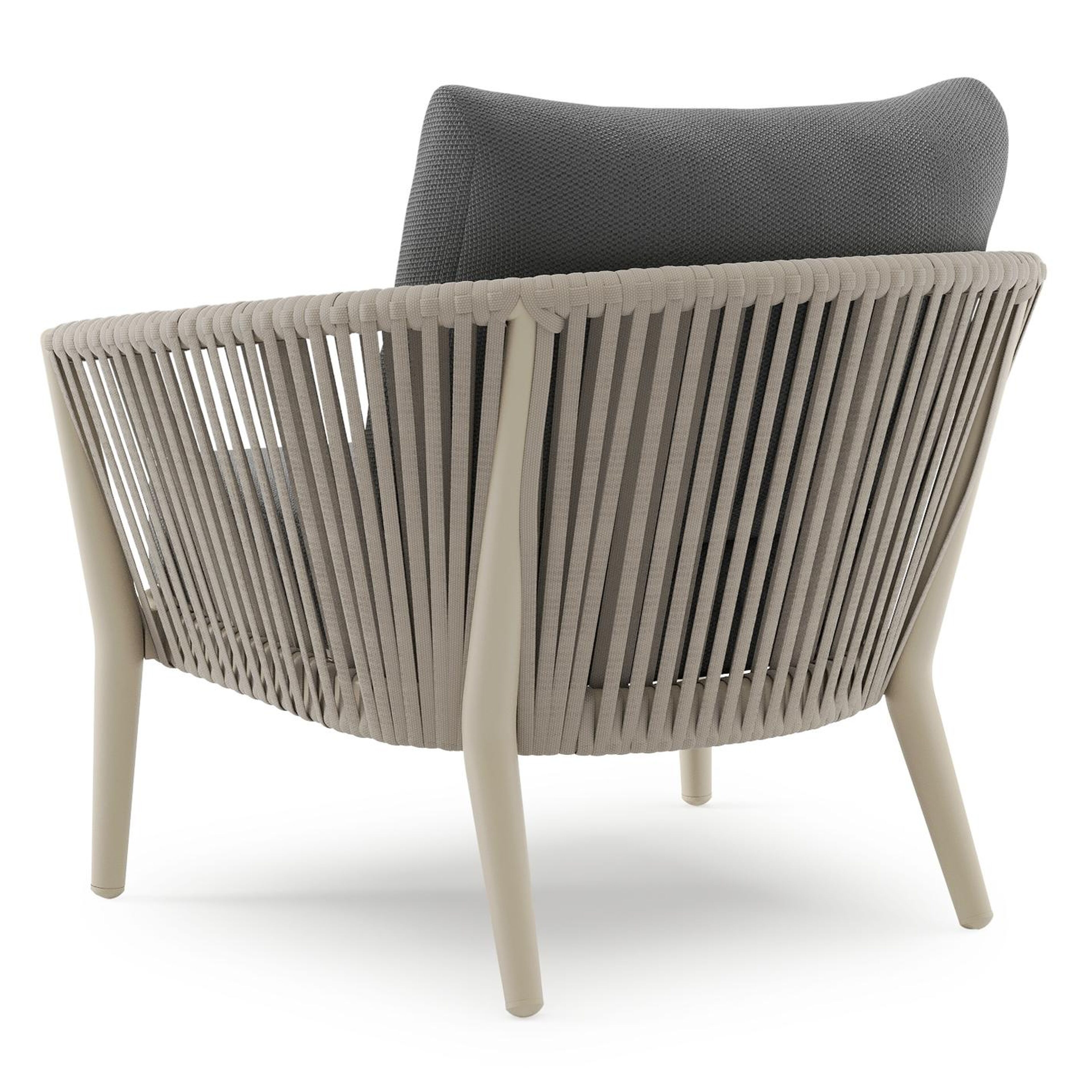 Fauteuil de jardin Orso en aluminium beige en corde luxe plate tissée verticalement beige et coussins en all weather sunbrella® luxe Lopi Shadow | Exterioo mobilier de jardin
