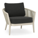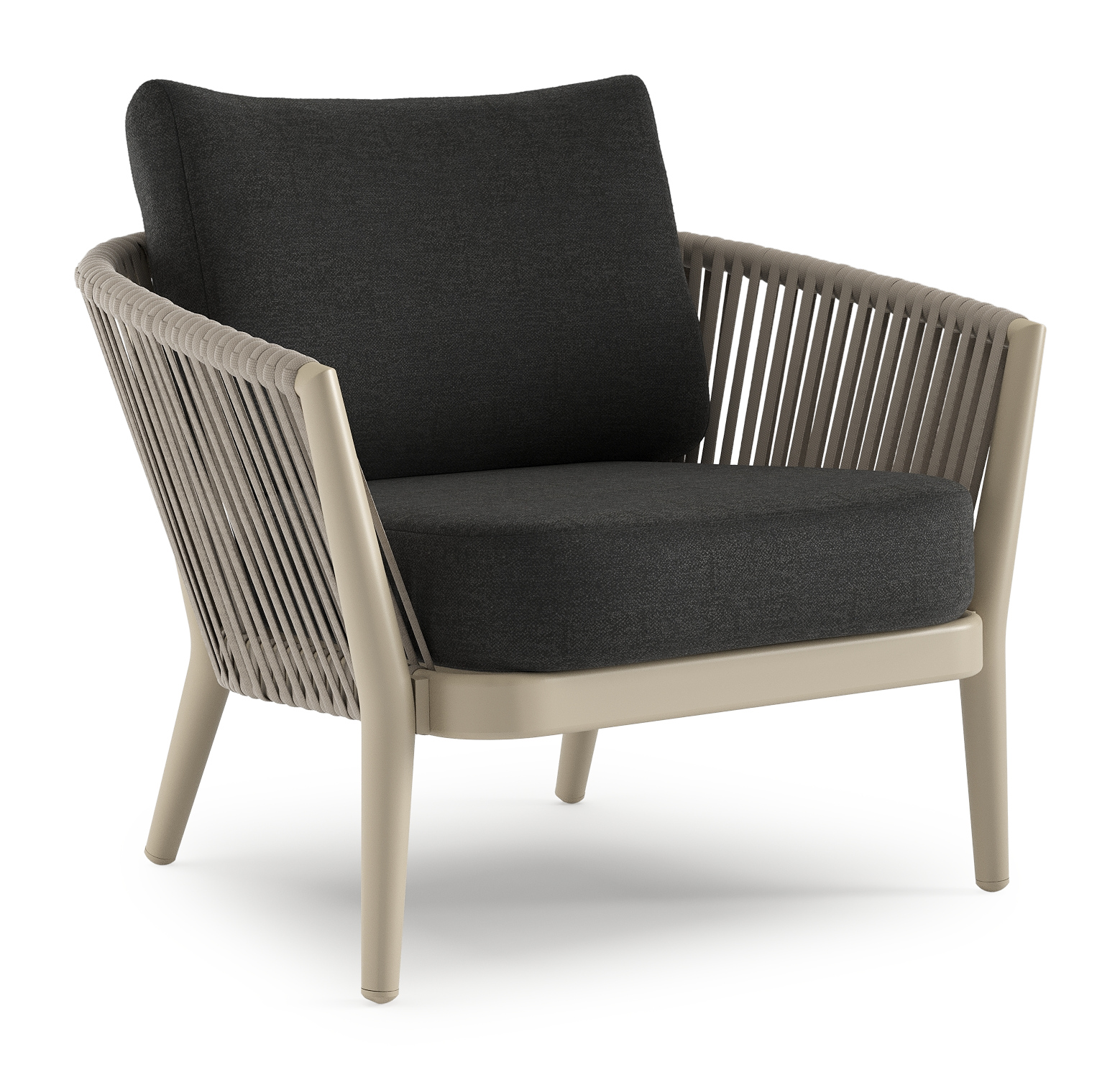Fauteuil de jardin Orso en aluminium beige et corde ronde tissée verticalement beige et coussins en all weather sunbrella® luxe chartres sooty | Exterioo mobilier de jardin