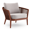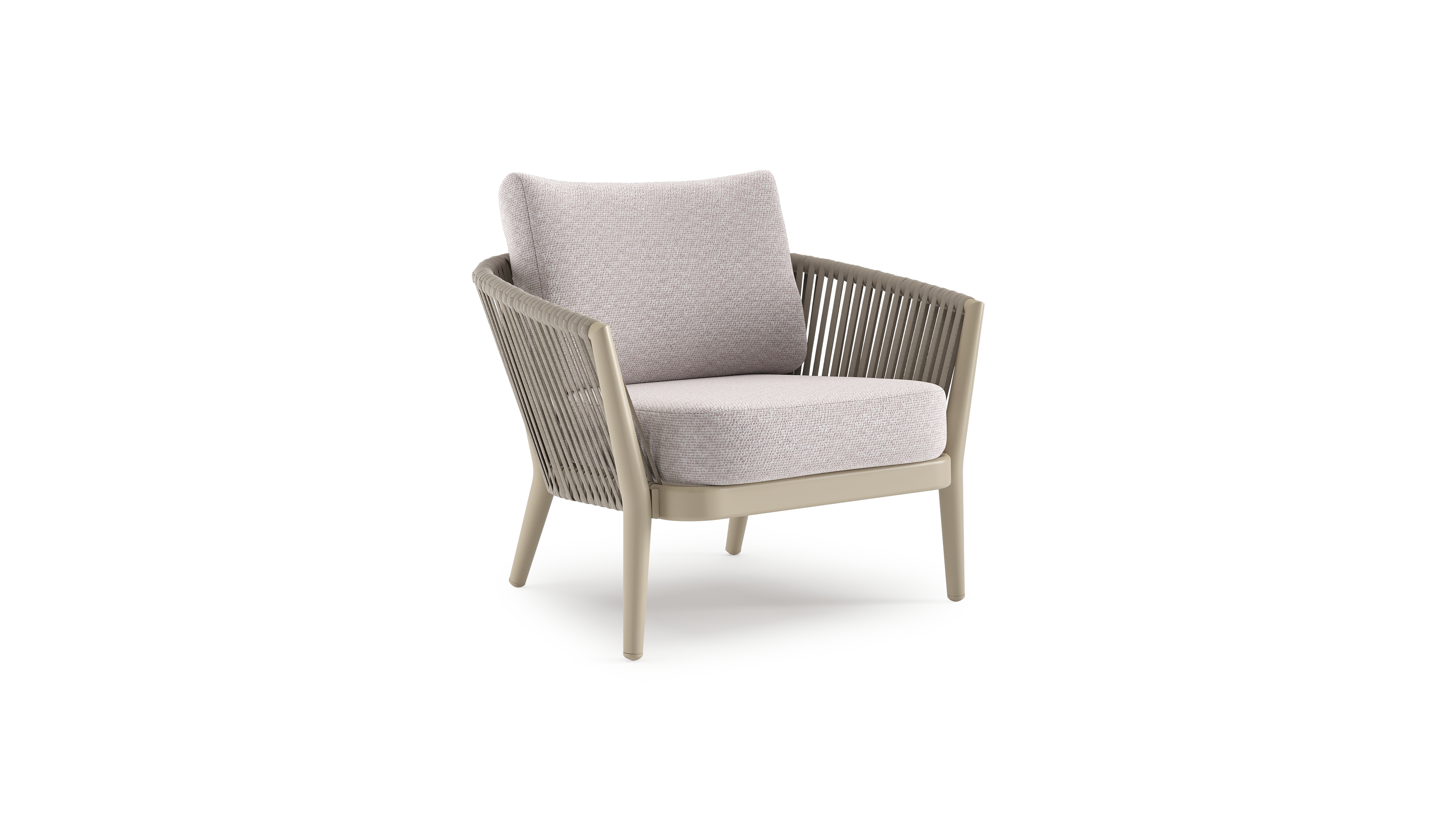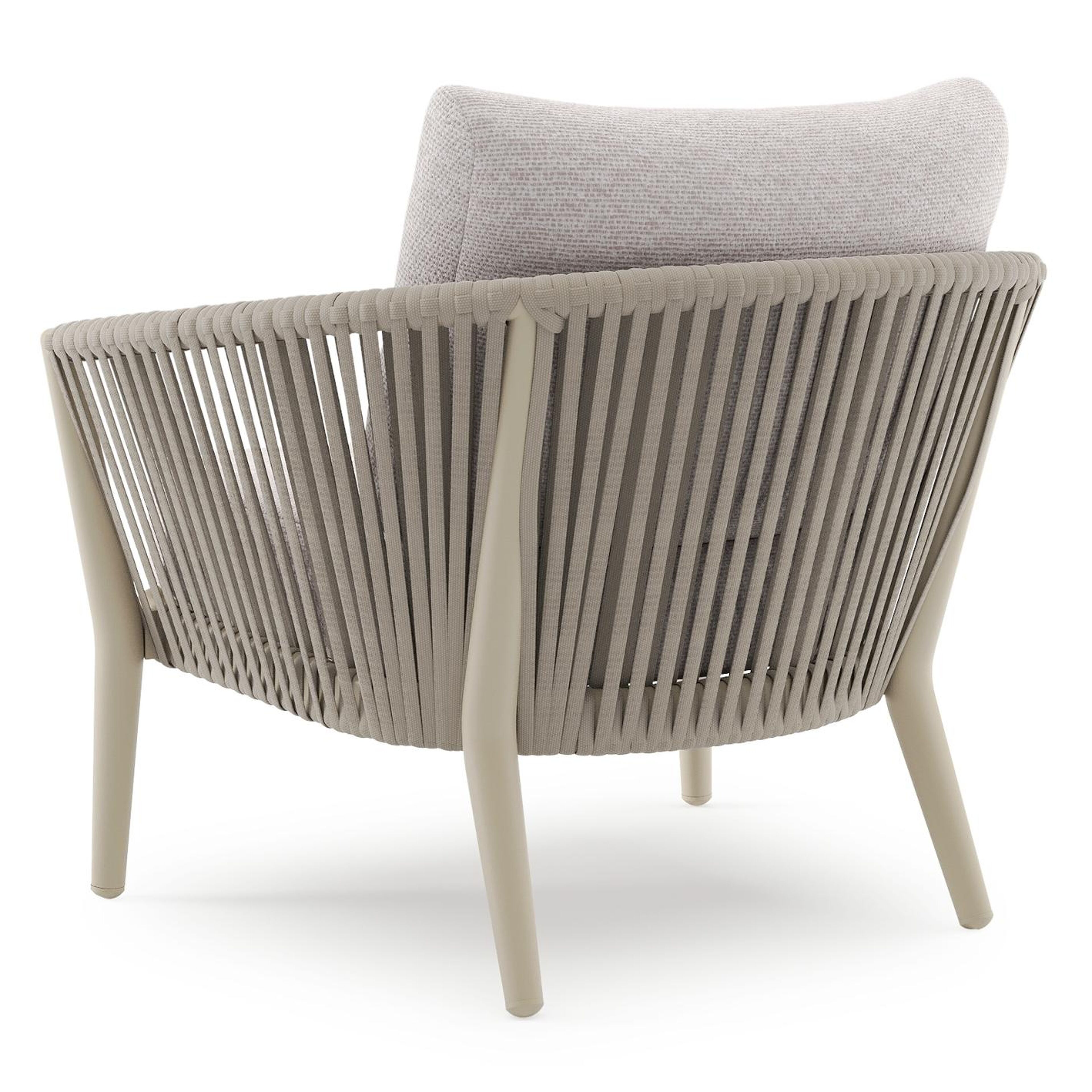 Fauteuil de jardin Orso en aluminium beige en corde luxe plate tissée verticalement beige et coussins en all weather sunbrella® luxe Wander Gobi | Exterioo mobilier de jardin