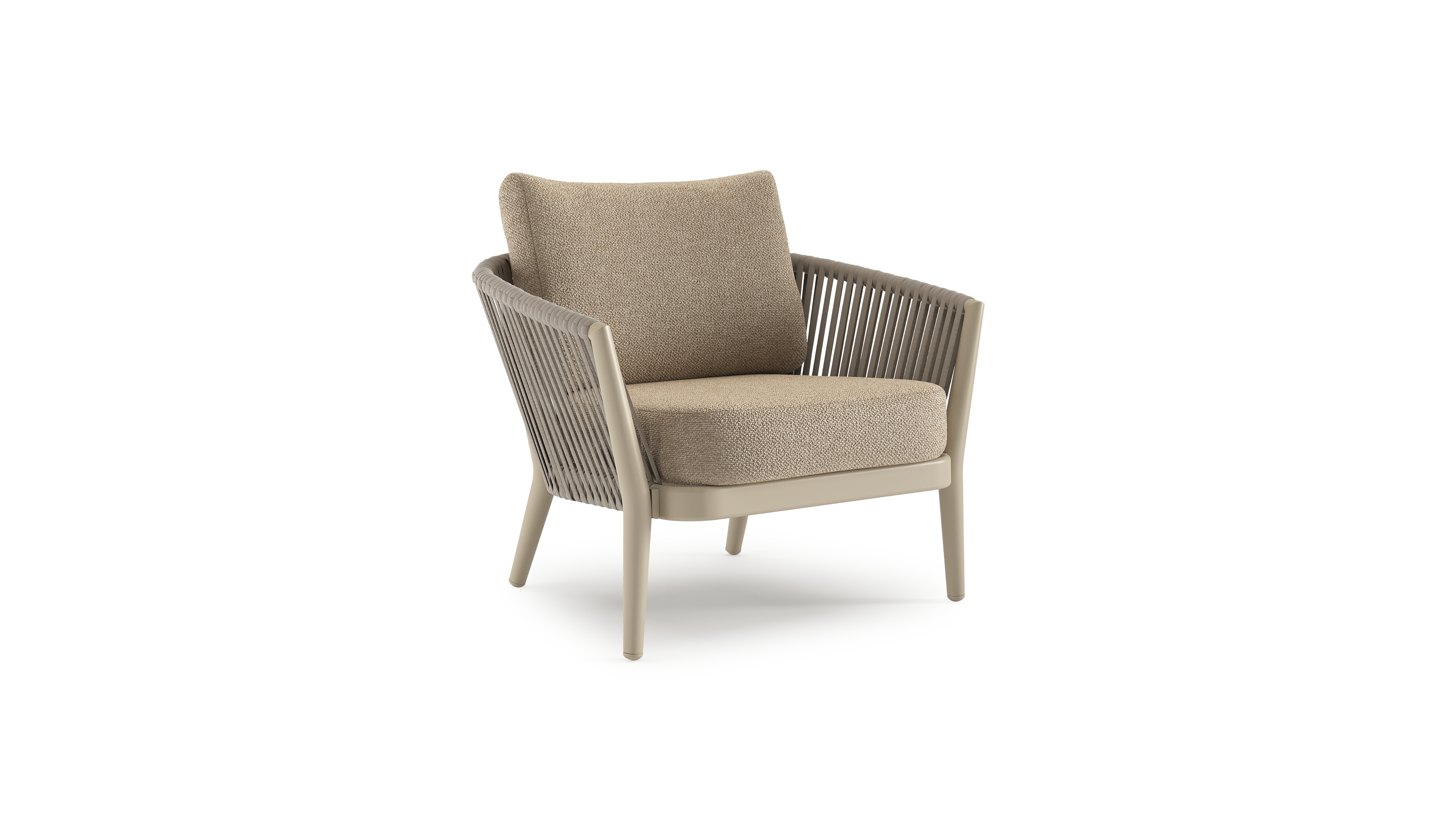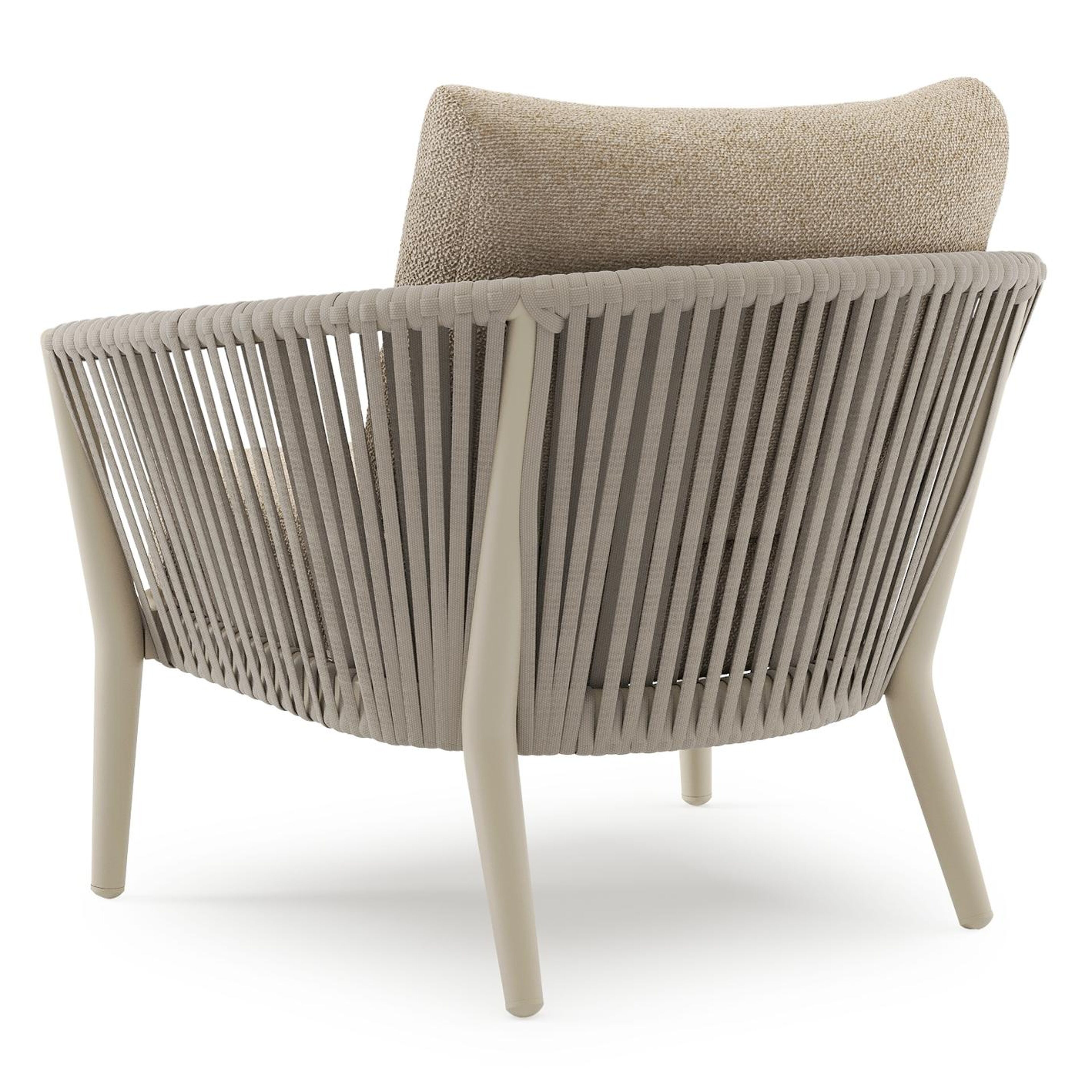 Fauteuil de jardin Orso en aluminium beige en corde luxe plate tissée verticalement beige et coussins en all weather cosytica Madagascar Oak | Exterioo mobilier de jardin