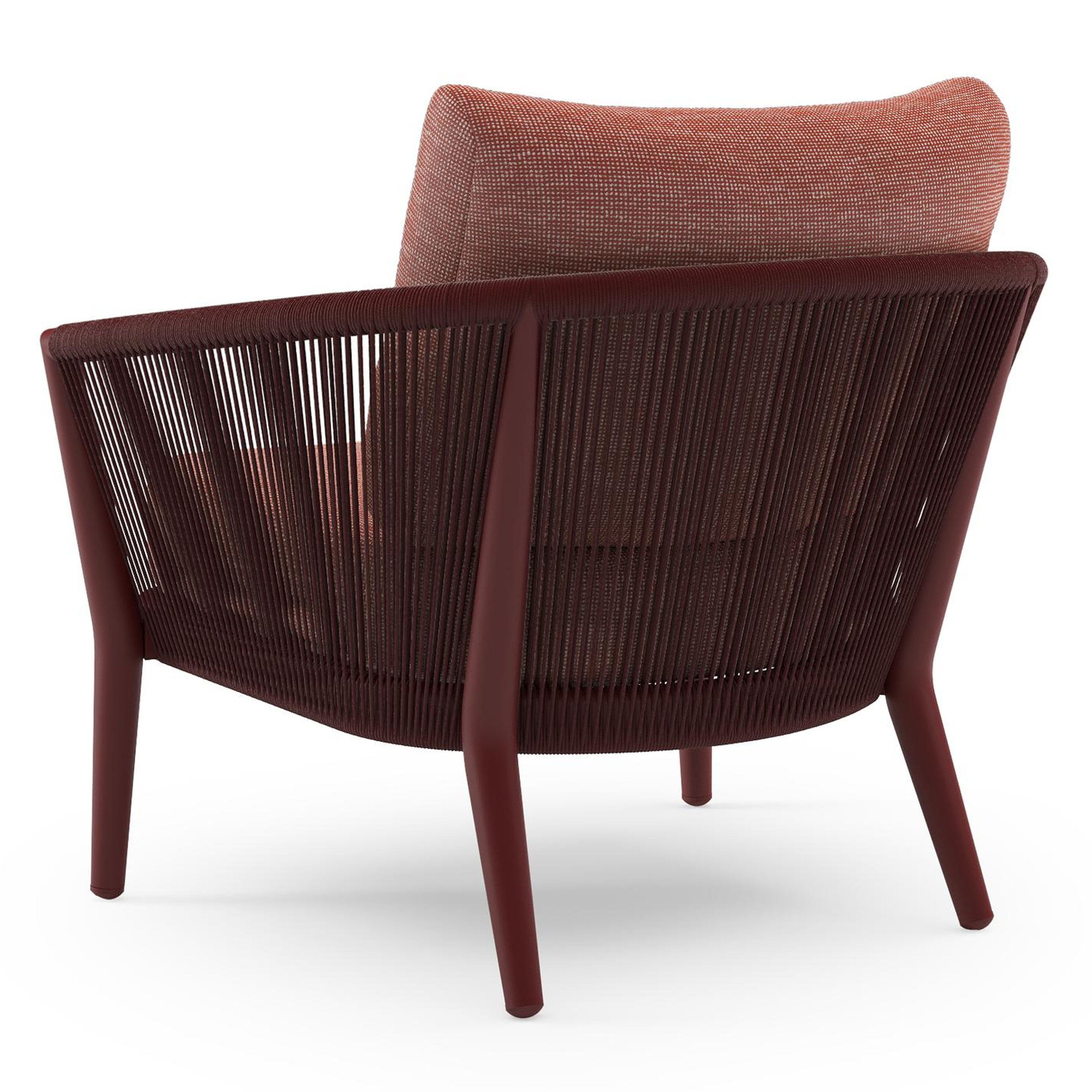 Fauteuil de jardin Orso en aluminium ruby en corde ronde tissée verticalement ruby et coussins en all weather sunbrella® luxe Slow Alezan | Exterioo mobilier de jardin