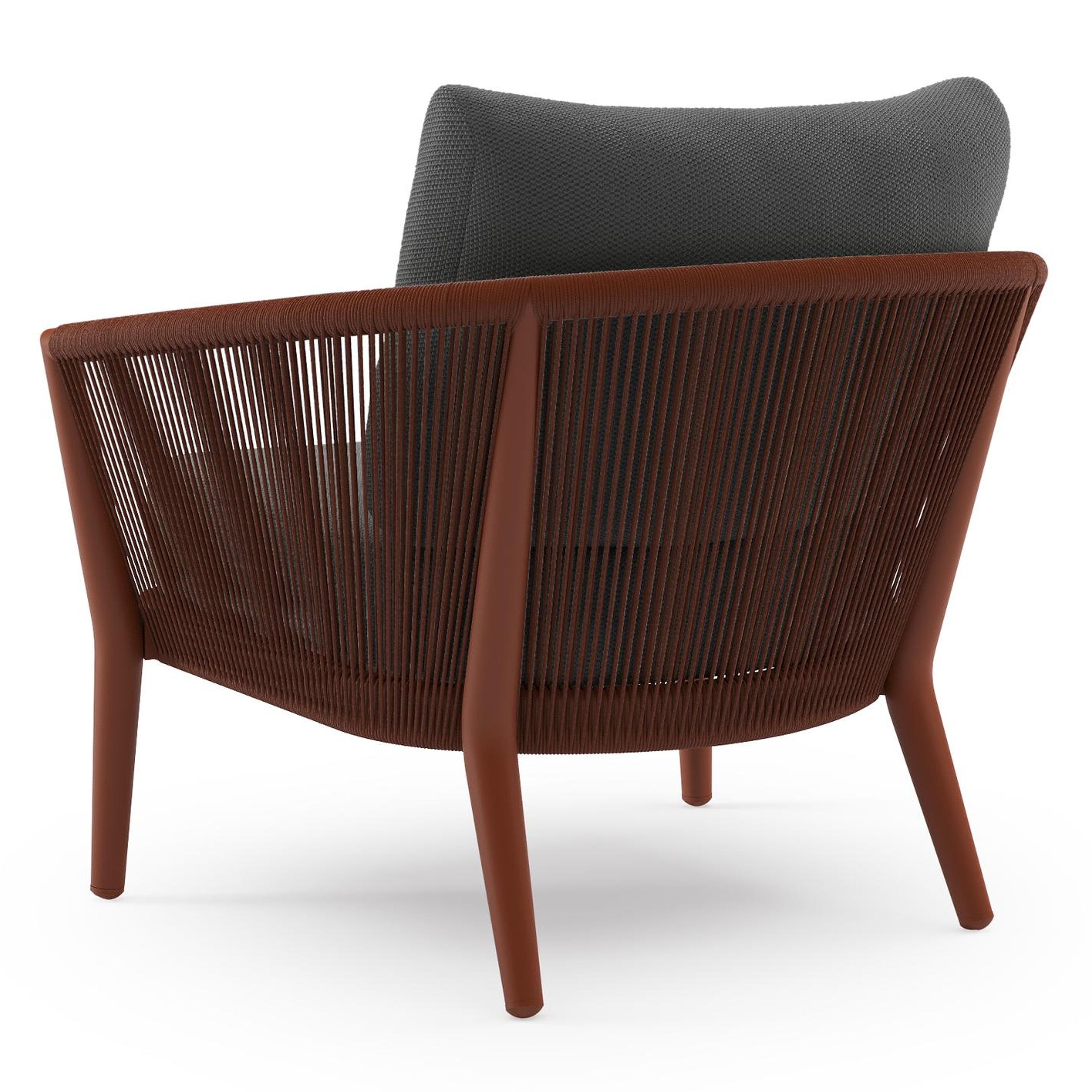Fauteuil de jardin Orso en aluminium brun rouille en corde ronde tissée verticalement brun rouille et coussins en all weather sunbrella® luxe Lopi Shadow | Exterioo mobilier de jardin